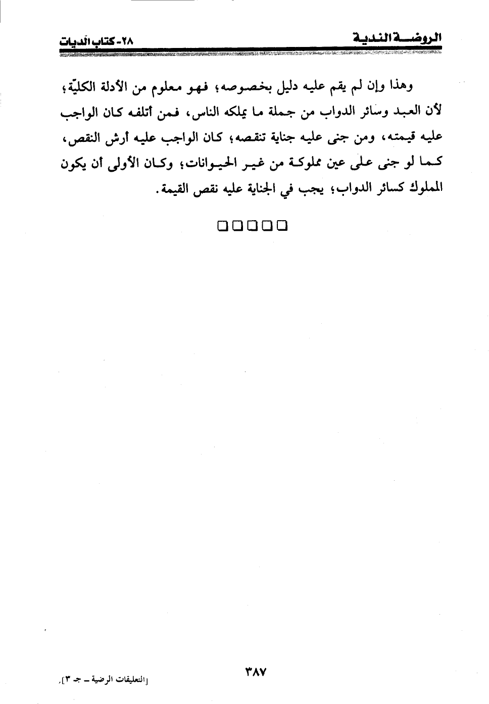 وهذا وإن لم يقم عليه دليل بخصوصه؛ فهو معلوم من الأدلة الكلية؛ لأن العبد وسائر الدواب من جملة ما يملكه الناس، فمن أتلفه كان الواجب عليه قيمته، ومن جنى عليه جناية تنقصه؛ كان الواجب عليه أرش النقص، كما لو جنى على عين مملوكة من غير الحيوانات؛ وكان الأولى أن يكون المملوك كسائر الدواب؛ يجب في الجناية عليه نقص القيمة.