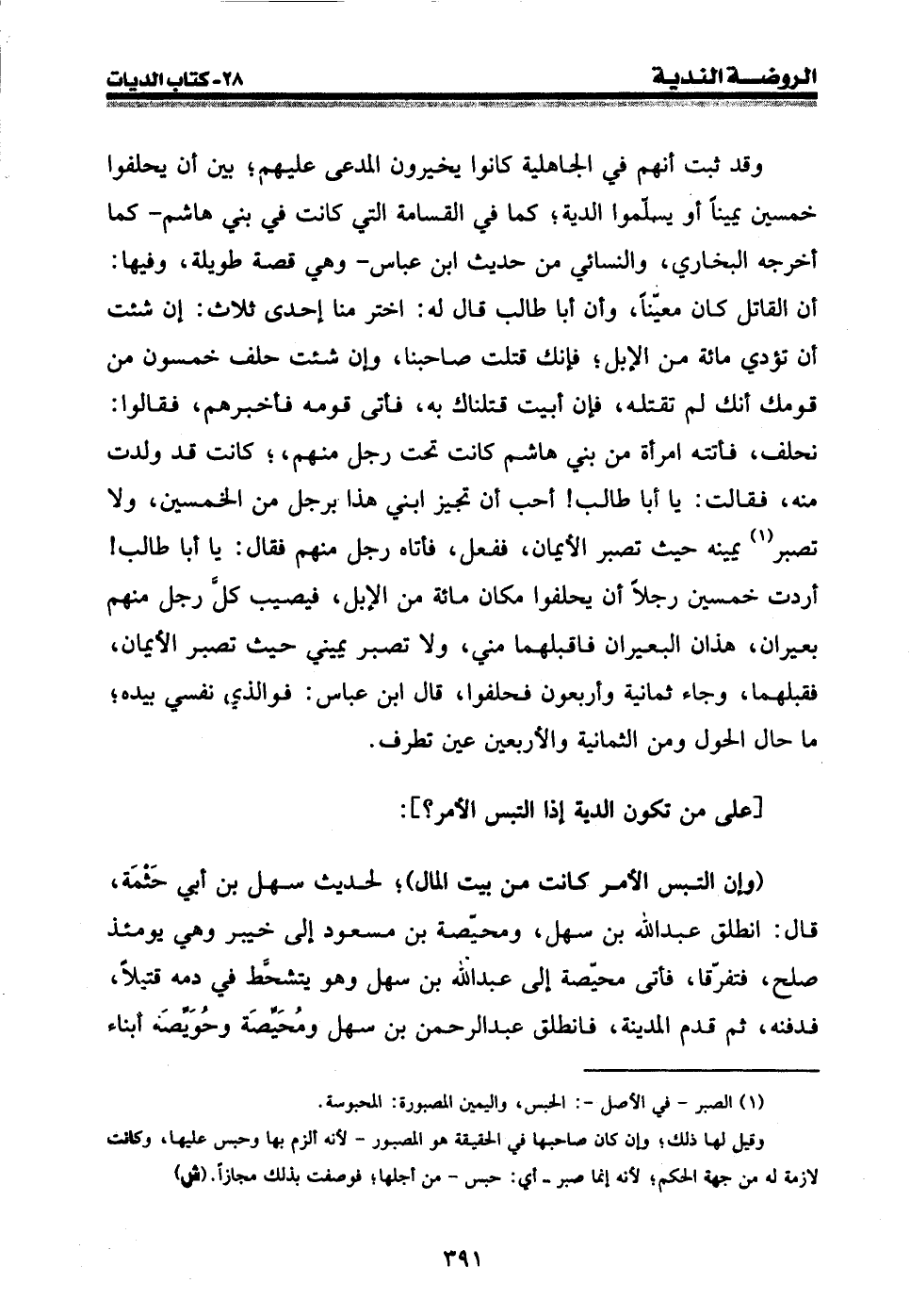 وقد ثبت أنهم في الجاهلية كانوا يخيرون المدعى عليهم، بين أن يحلفوا خمسين يمينا أو يسلموا الدية؛ كما في القسامة التي كانت في بني هاشم - كما أخرجه البخاري، والنسائي من حديث ابن عباس - وهي قصة طويلة، وفيها: أن القاتل كان معينا، وأن أبا طالب قال له: اختر منا إحدى ثلاث: إن شئت أن تؤدي مائة من الإبل؛ فإنك قتلت صاحبنا، وإن شئت حلف خمسون من قومك أنك لم تقتله، فإن أبيت قتلناك به، فأتى قومه فأخبرهم، فقالوا: نحلف، فأتته امرأة من بني هاشم كانت تحت رجل منهم،؛ كانت قد ولدت منه، فقالت: يا أبا طالب {أحب أن تجيز ابني هذا برجل من الخمسين، ولا تصبر (¬1) يمينه حيث تصبر الأيمان، ففعل، فأتاه رجل منهم فقال: يا أبا طالب} أردت خمسين رجلا أن يحلفوا مكان مائة من الإبل، فيصيب كل رجل منهم بعيران، هذان البعيران فاقبلهما مني، ولا تصبر يميني حيث تصبر الأيمان، فقبلهما، وجاء ثمانية وأربعون فحلفوا، قال ابن عباس: فوالذي نفسي بيده؛ ما حال الحول ومن الثمانية والأربعين عين تطرف.