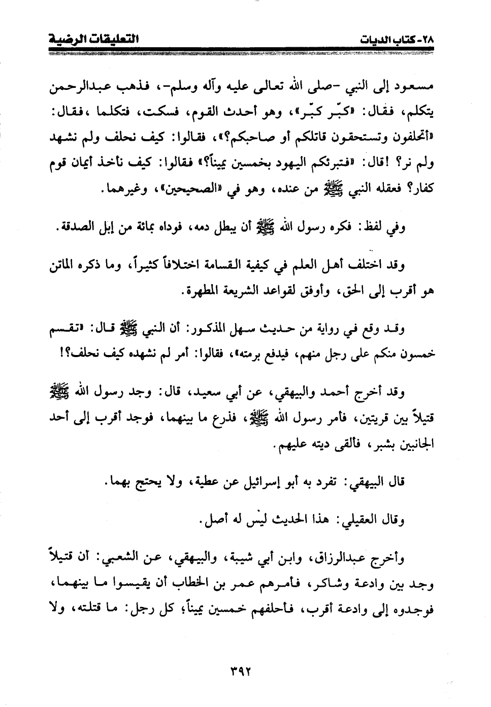 مسعود إلى النبي - صلى الله عليه وسلم -، فذهب عبد الرحمن يتكلم، فقال: " كبر كبر "، وهو أحدث القوم، فسكت، فتكلما، فقال: " أتحلفون وتستحقون قاتلكم أو صاحبكم؟ "، فقالوا: كيف نحلف ولم نشهد ولم نر؟ {قال: " فتبرئكم اليهود بخمسين يمينا؟ " فقالوا: كيف نأخذ أيمان قوم كفار؟ فعقله النبي صلى الله عليه وسلم من عنده، وهو في " الصحيحين "، وغيرهما.