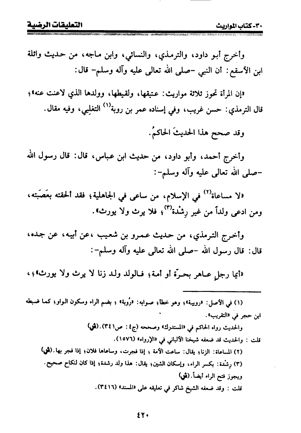 " إن المرأة تحوز ثلاثة مواريث: عتيقها، ولقيطها، وولدها الذي لاعنت عنه "؛ قال الترمذي: حسن غريب، وفي إسناده عمر بن روبة (¬1) التغلبي، وفيه مقال.