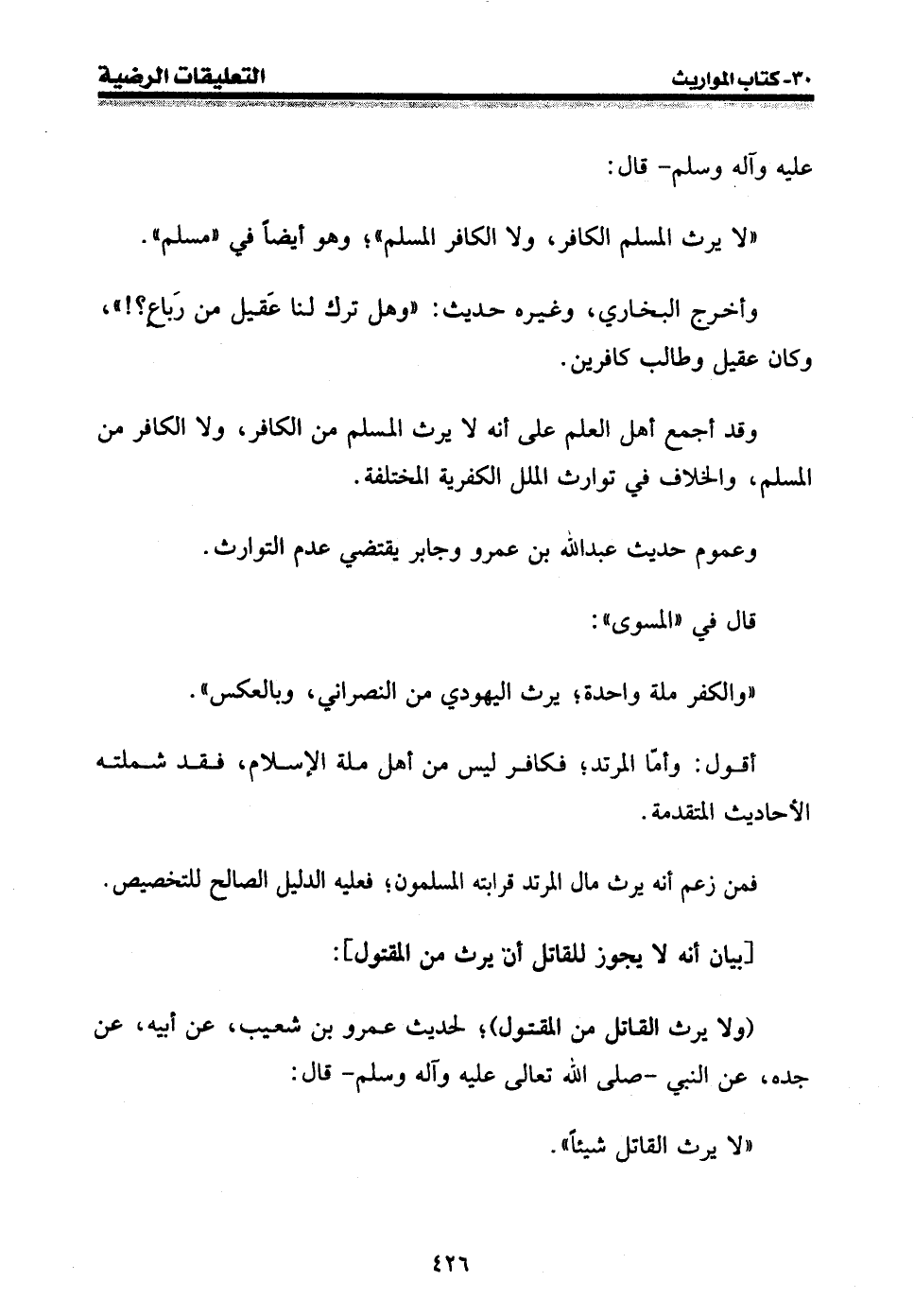 " لا يرث المسلم الكافر، ولا الكافر المسلم "؛ وهو أيضا في " مسلم ".