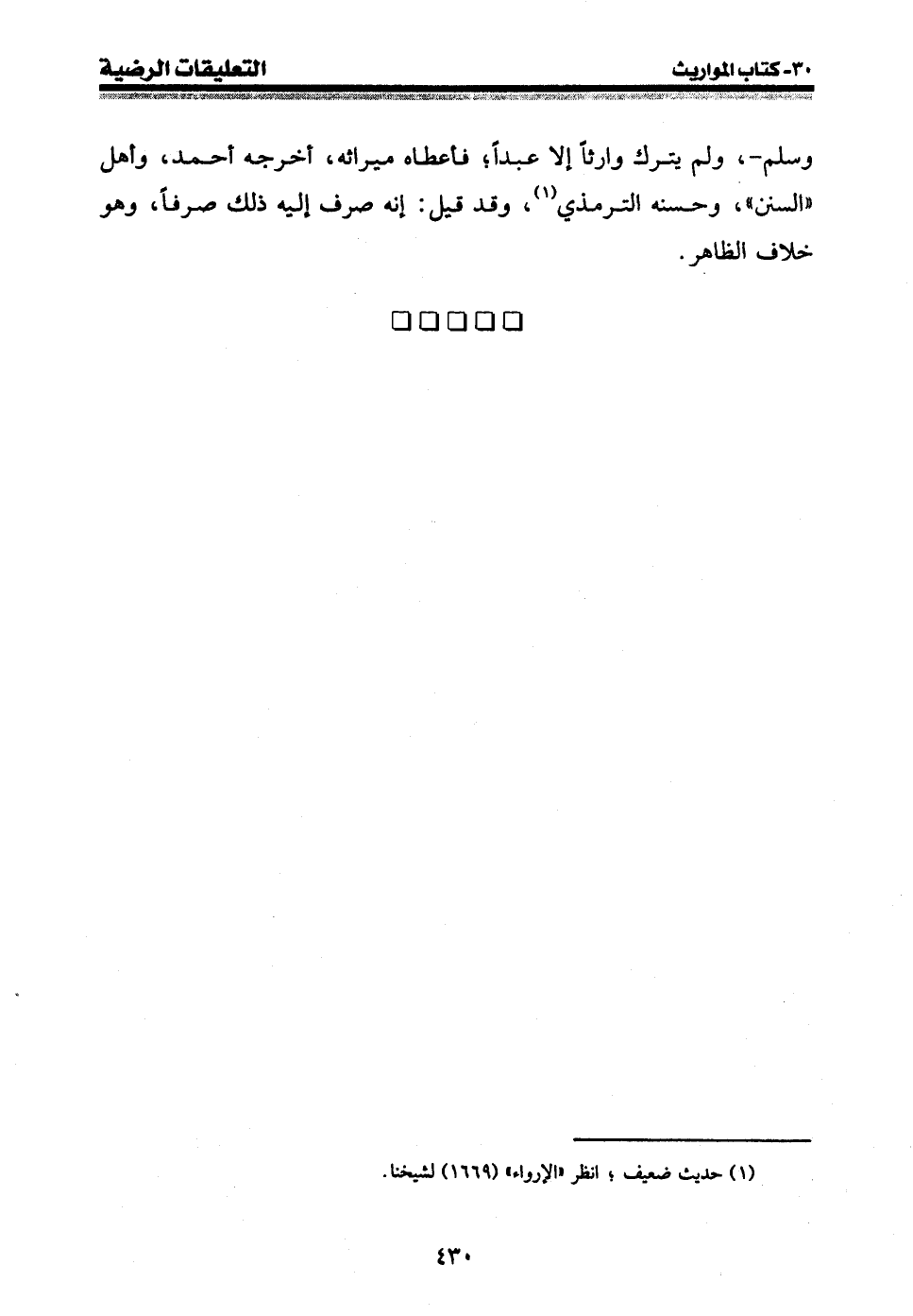 -، ولم يترك وارثا إلا عبدا؛ فأعطاه ميراثه، أخرجه أحمد، وأهل " السنن "، وحسنه الترمذي (¬1) ، وقد قيل: إنه صرف إليه ذلك صرفا، وهو خلاف الظاهر.