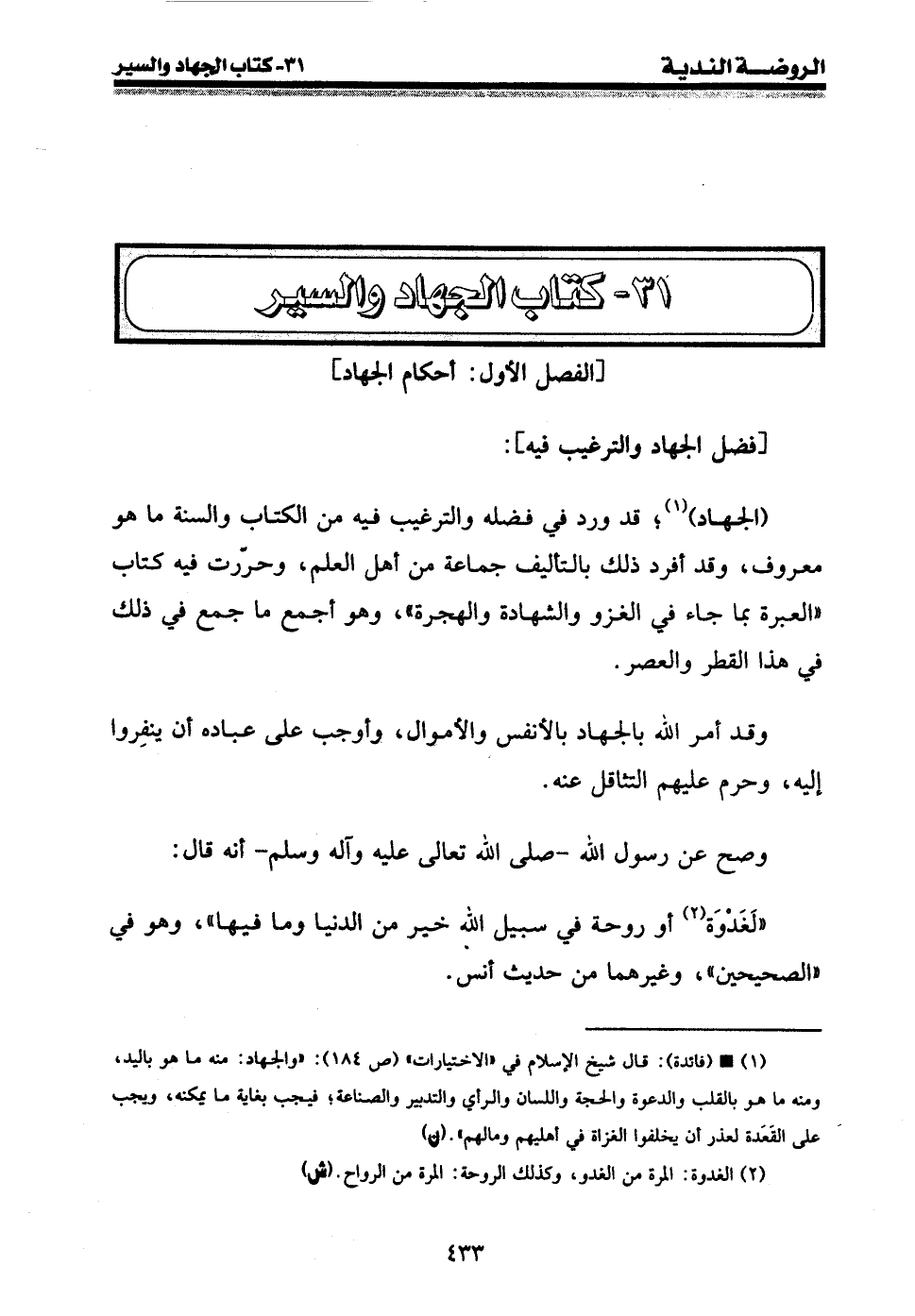 (الجهاد) (¬1) ؛ قد ورد في فضله والترغيب فيه من الكتاب والسنة ما هو معروف، وقد أفرد ذلك بالتأليف جماعة من أهل العلم، وحررت فيه كتاب " العبرة بما جاء في الغزو والشهادة والهجرة "، وهو أجمع ما جمع في ذلك في هذا القطر والعصر.