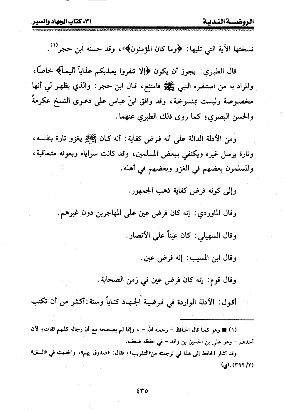 قال الطبري: يجوز أن يكون {إلا تنفروا يعذبكم عذابا أليما} خاصا، والمراد به من استنفره النبي صلى الله عليه وسلم فامتنع، قال ابن حجر: والذي يظهر لي أنها مخصوصة وليست بمنسوخة، وقد وافق ابن عباس على دعوى النسخ عكرمة والحسن البصري؛ كما روى ذلك الطبري عنهما.