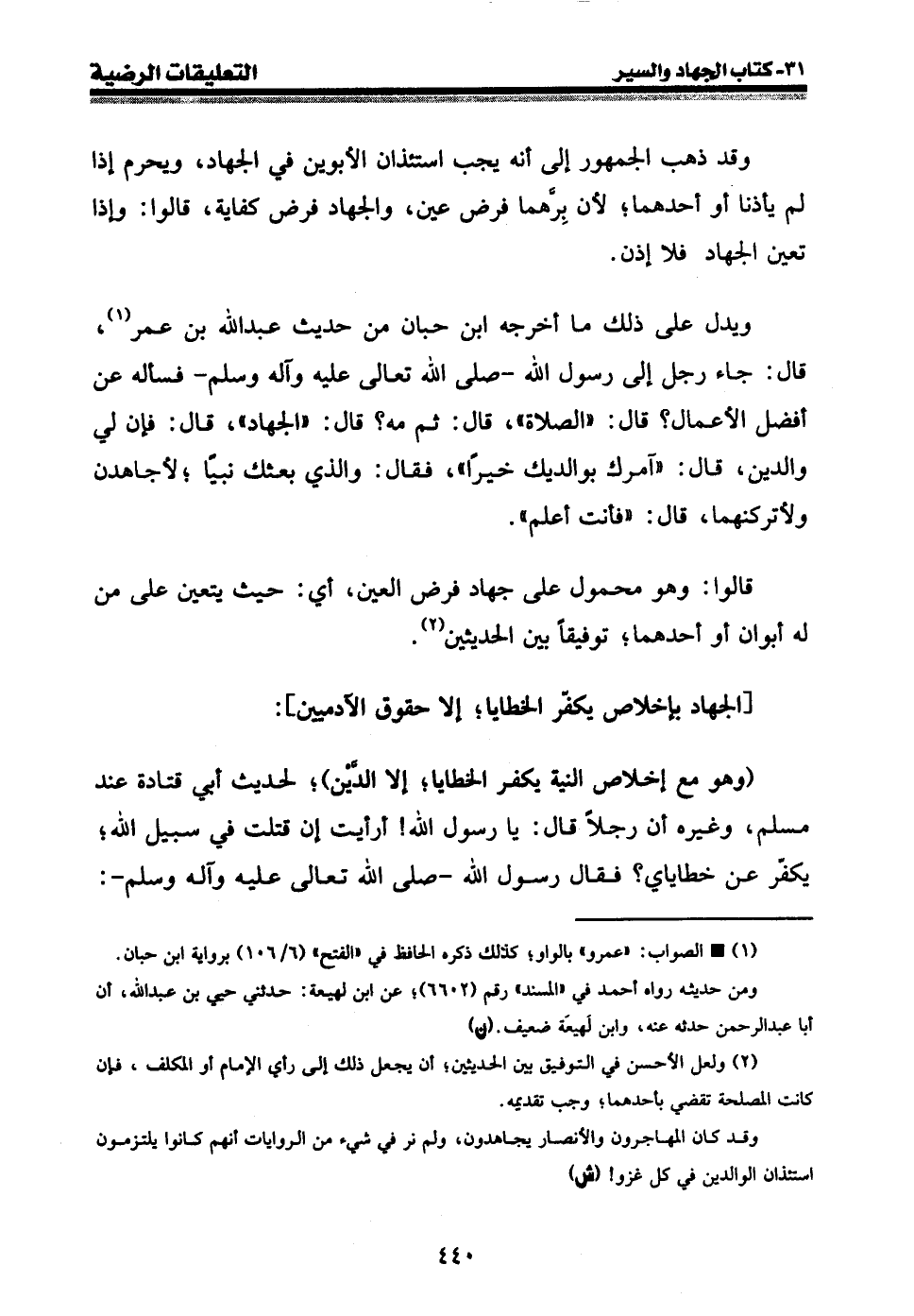 وقد كان المهاجرون والأنصار يجاهدون، ولم نر في شيء من الروايات أنهم كانوا يلتزمون استئذان الوالدين في كل غزو} (ش)