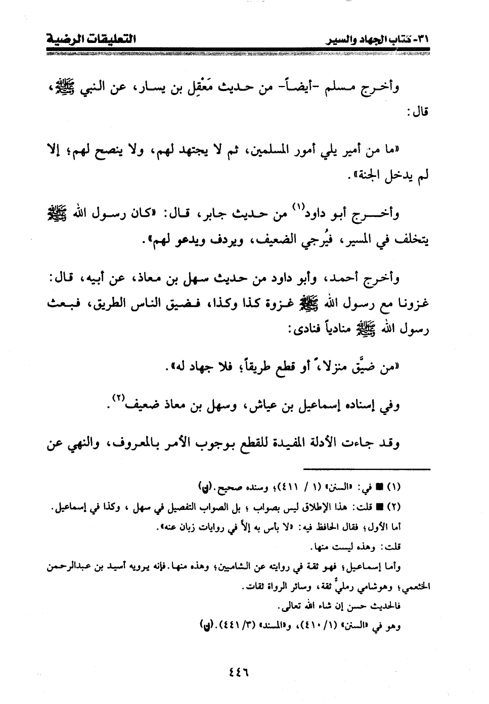 وأخرج أحمد، وأبو داود من حديث سهل بن معاذ، عن أبيه، قال: غزونا مع رسول الله صلى الله عليه وسلم غزوة كذا وكذا، فضيق الناس الطريق، فبعث رسول الله صلى الله عليه وسلم مناديا فنادى: