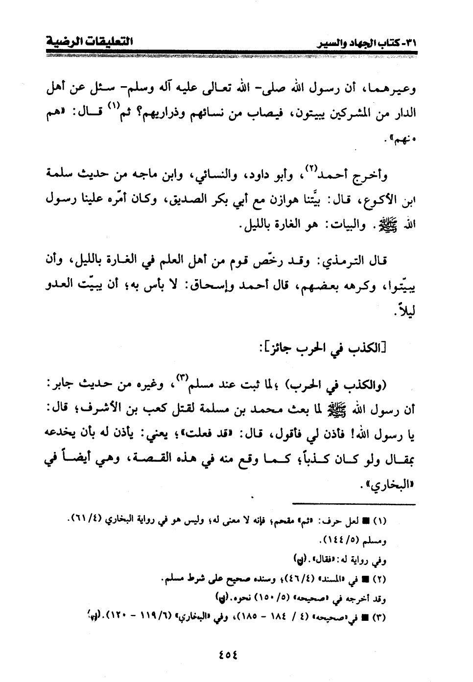 قال الترمذي: وقد رخص قوم من أهل العلم في الغارة بالليل، وأن يبيتوا، وكرهه بعضهم، قال أحمد وإسحاق: لا بأس به؛ أن يبيت العدو ليلا.