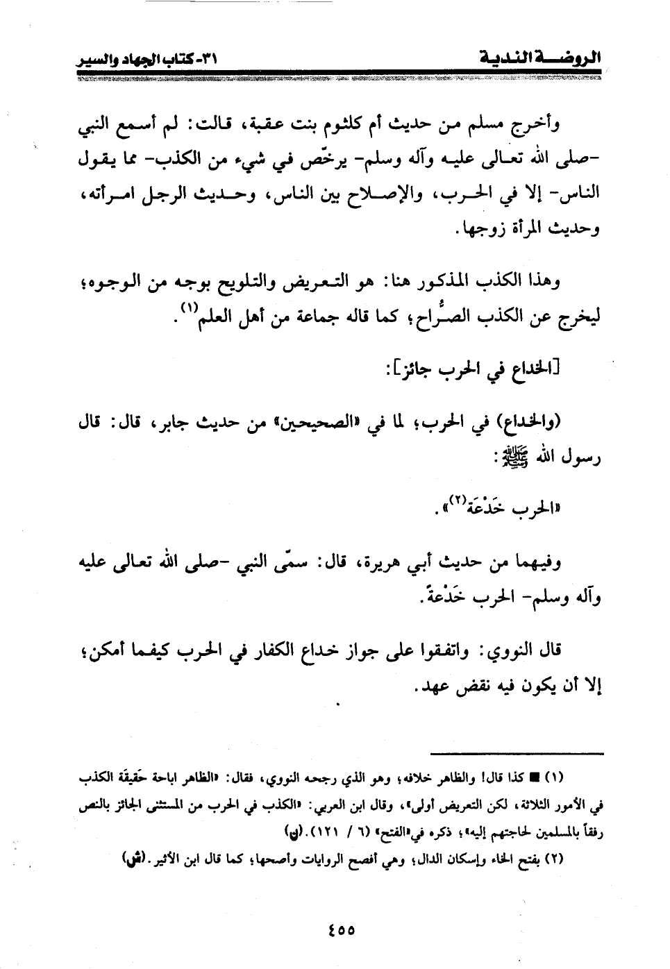 (¬1) • كذا قال! والظاهر خلافه؛ وهو الذي رجحه النووي، فقال: " الظاهر إباحة حقيقة الكذب في الأمور الثلاثة، لكن التعريض أولى "، وقال ابن العربي: " الكذب في الحرب من المستثنى الجائز بالنص رفقا بالمسلمين لحاجتهم إليه "؛ ذكره في " الفتح " (6 / 121) . (ن)