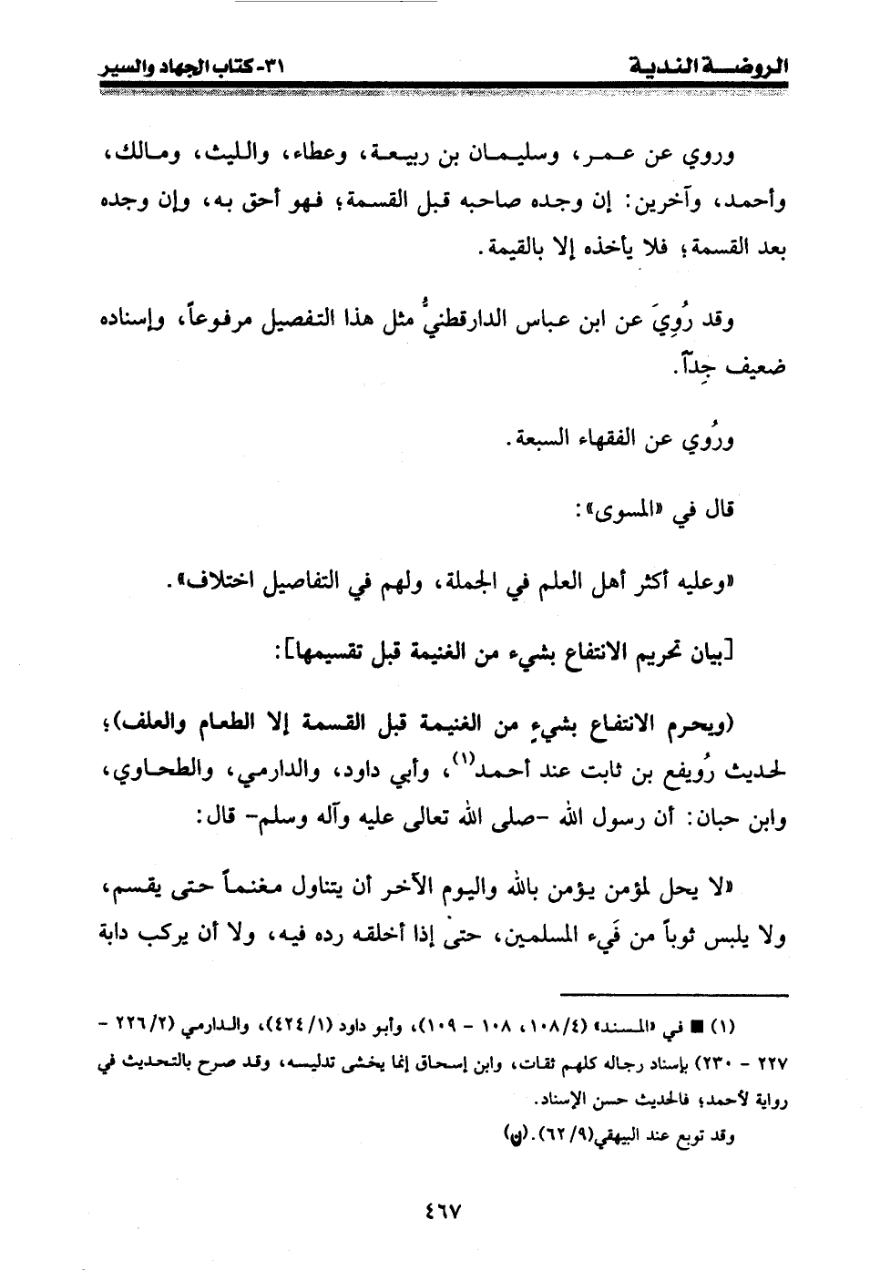 " لا يحل لمؤمن يؤمن بالله واليوم الآخر أن يتناول مغنما حتى يقسم، ولا يلبس ثوبا من فيء المسلمين، حتى إذا أخلقه رده فيه، ولا أن يركب دابة