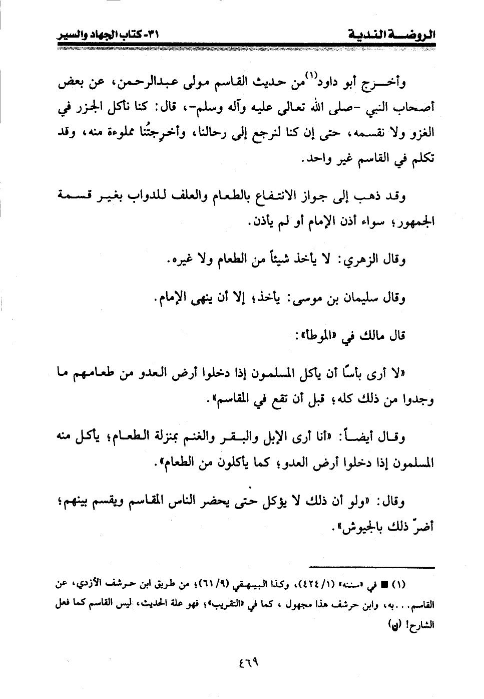 وقال أيضا: " أنا أرى الإبل والبقر والغنم بمنزلة الطعام؛ يأكل منه المسلمون إذا دخلوا أرض العدو؛ كما يأكلون من الطعام ".