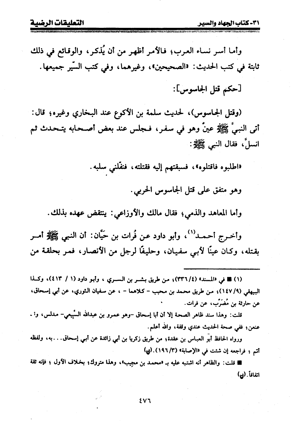 (وقتل الجاسوس) ، لحديث سلمة بن الأكوع عند البخاري وغيره؛ قال: أتى النبي صلى الله عليه وسلم عين وهو في سفر، فجلس عند بعض أصحابه يتحدث ثم انسل، فقال النبي صلى الله عليه وسلم: