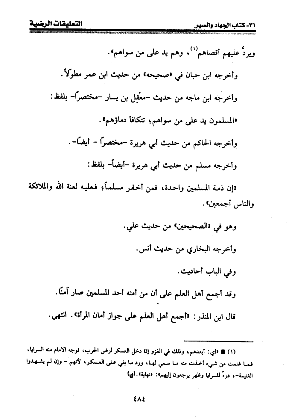 " المسلمون يد على من سواهم؛ تتكافأ دماؤهم ".