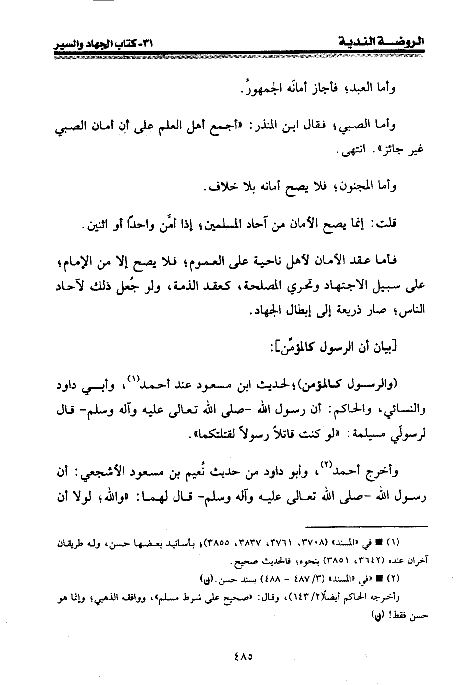 (والرسول كالمؤمن) ؛ لحديث ابن مسعود عند أحمد (¬1) ، وأبي داود والنسائي، والحاكم: أن رسول الله - صلى الله عليه وسلم - قال لرسولَي مسيلمة: " لو كنت قاتلا رسولا لقتلتكما ".