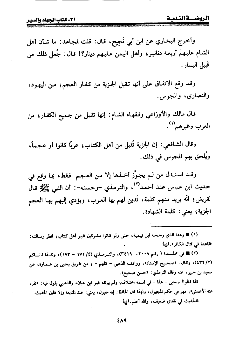 (¬1) • وهذا الذي رجحه ابن تيمية، حتى ولو كانوا مشركين غير أهل كتاب؛ انظر رسالته: " قاعدة في قتال الكافر ". (ن)