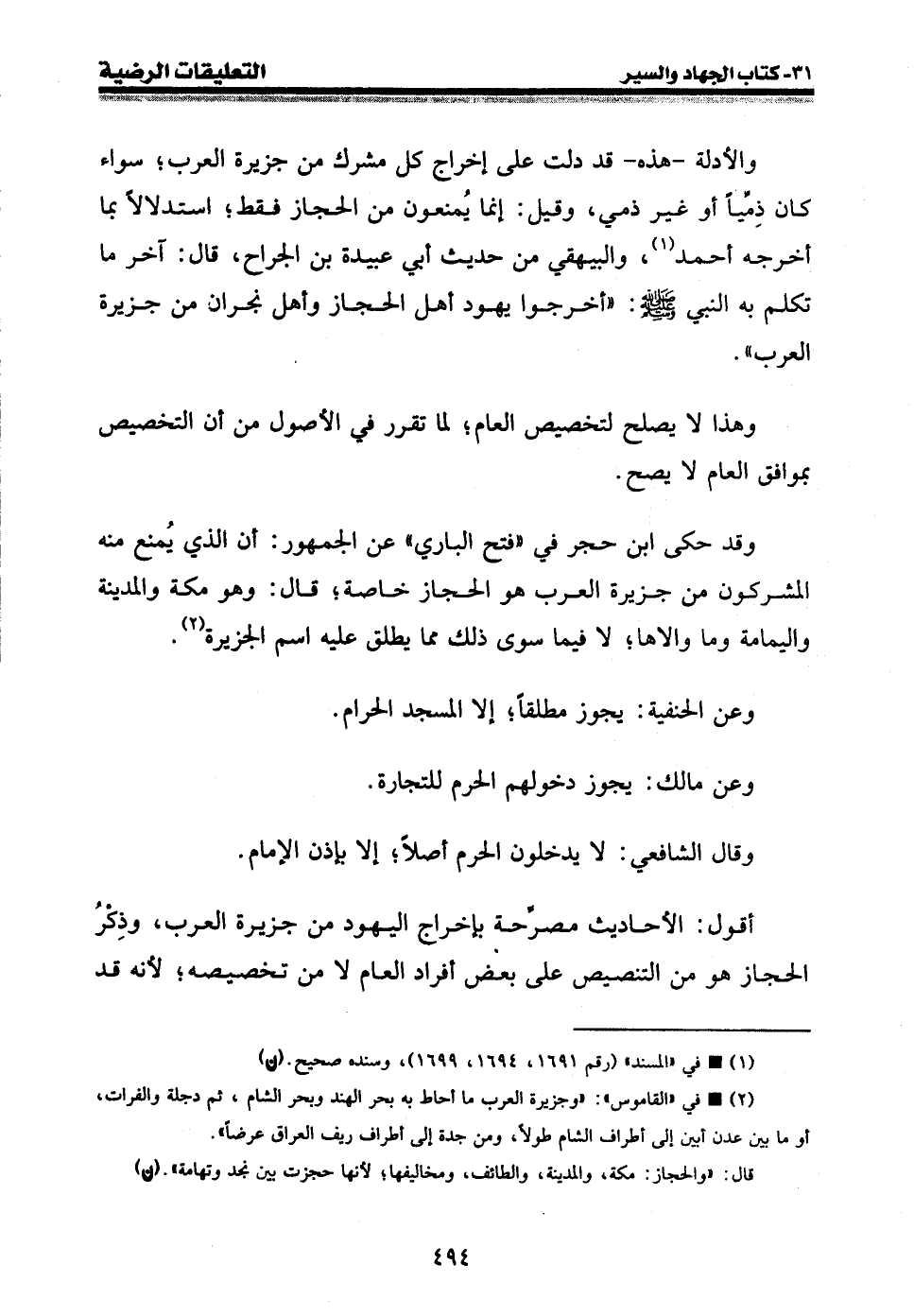 وقد حكى ابن حجر في " فتح الباري " عن الجمهور: أن الذي يمنع منه المشركون من جزيرة العرب هو الحجاز خاصة؛ قال: وهو مكة والمدينة واليمامة وما والاها؛ لا فيما سوى ذلك مما يطلق عليه اسم الجزيرة (¬2) .