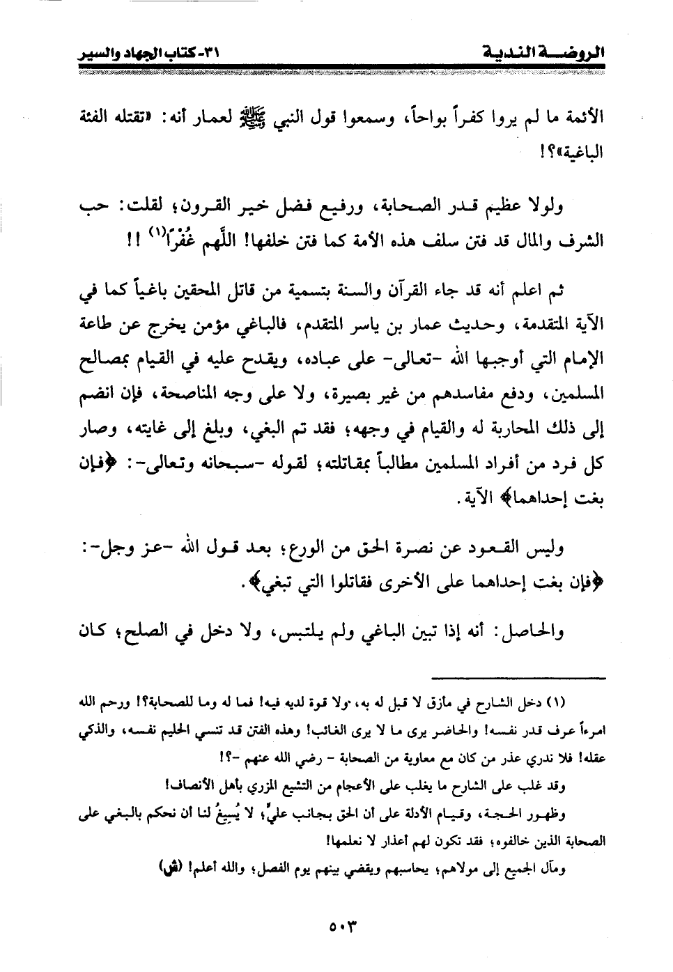 (¬1) دخل الشارح في مأزق لا قبل له به، ولا قوة لديه فيه {فما له وما للصحابة؟} ورحم الله امرءا عرف قدر نفسه {والحاضر يرى ما لا يرى الغائب} وهذه الفتن قد تنسي الحليم نفسه، والذكي عقله {فلا ندري عذر من كان مع معاوية من الصحابة - رضي الله عنهم -؟}
