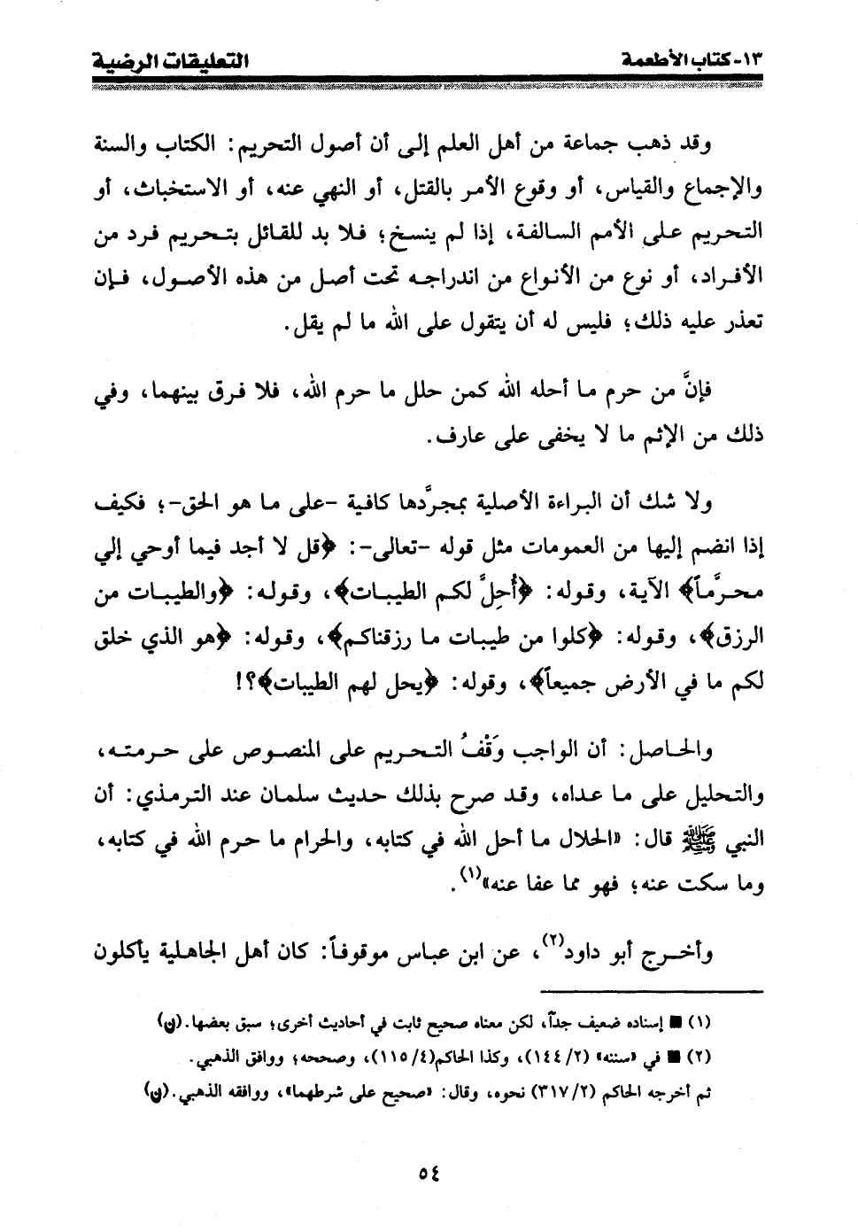 والحاصل: أن الواجب وقف التحريم على المنصوص على حرمته، والتحليل على ما عداه، وقد صرح بذلك حديث سلمان عند الترمذي: أن النبي صلى الله عليه وسلم قال: " الحلال ما أحل الله في كتابه، والحرام ما حرم الله في كتابه، وما سكت عنه؛ فهو مما عفا عنه " (¬1) .