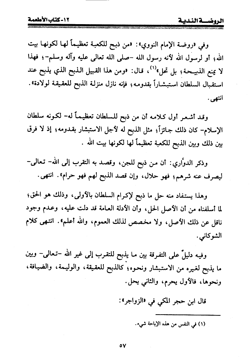 وفي " روضة الإمام النووي ": " من ذبح للكعبة تعظيما لها لكونها بيت الله؛ أو لرسول الله لأنه رسول الله - صلى الله عليه وسلم -؛ فهذا لا يمنع الذبيحة؛ بل تحل " (¬1) ، قال: " ومن هذا القبيل الذبح الذي يذبح عند استقبال السلطان استبشارا بقدومه؛ فإنه نازل منزلة الذبح للعقيقة لولادة ". انتهى.
