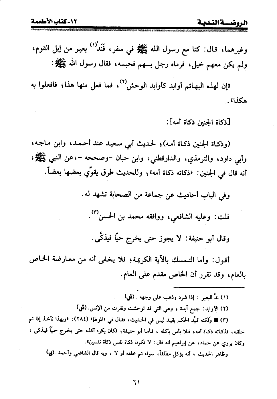 (¬3) • ولكنه قيد الحكم بقيد ليس في الحديث، فقال في " الموطإ " (284) : " وبهذا نأخذ إذا تم خلقه، فذكاته ذكاة أمه؛ فلا بأس بأكله، فأما أبو حنيفة؛ فكان يكره أكله حتى يخرج حيا فيذكى، وكان يروي عن حماد، عن إبراهيم أنه قال: لا تكون ذكاة نفس ذكاة نفسين ".