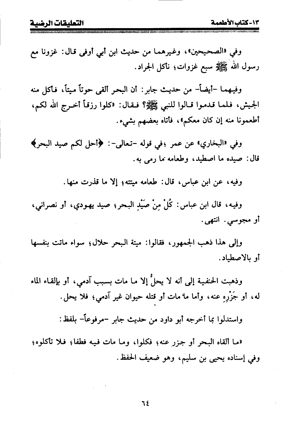 " ما ألقاه البحر أو جزر عنه؛ فكلوا، وما مات فيه فطفا؛ فلا تأكلوه؛ وفي إسناده يحيى بن سليم، وهو ضعيف الحفظ.