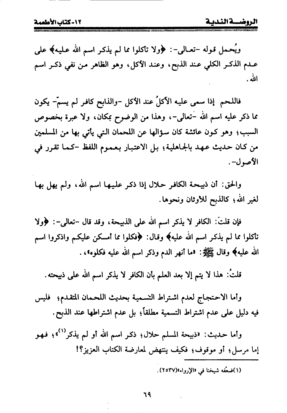 وأما حديث: " ذبيحة المسلم حلال؛ ذكر اسم الله أو لم يذكر (¬1) "؛ فهو إما مرسل؛ أو موقوف؛ فكيف ينتهض لمعارضة الكتاب العزيز؟ !
