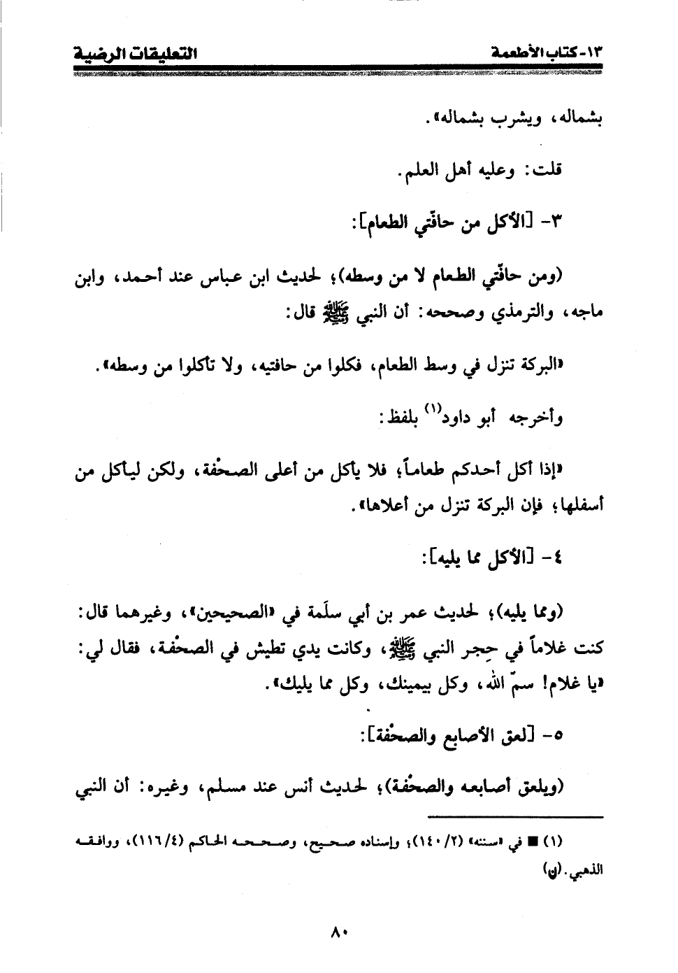 (ومن حافتي الطعام لا من وسطه) ؛ لحديث ابن عباس عند أحمد، وابن ماجه، والترمذي وصححه: أن النبي صلى الله عليه وسلم قال: