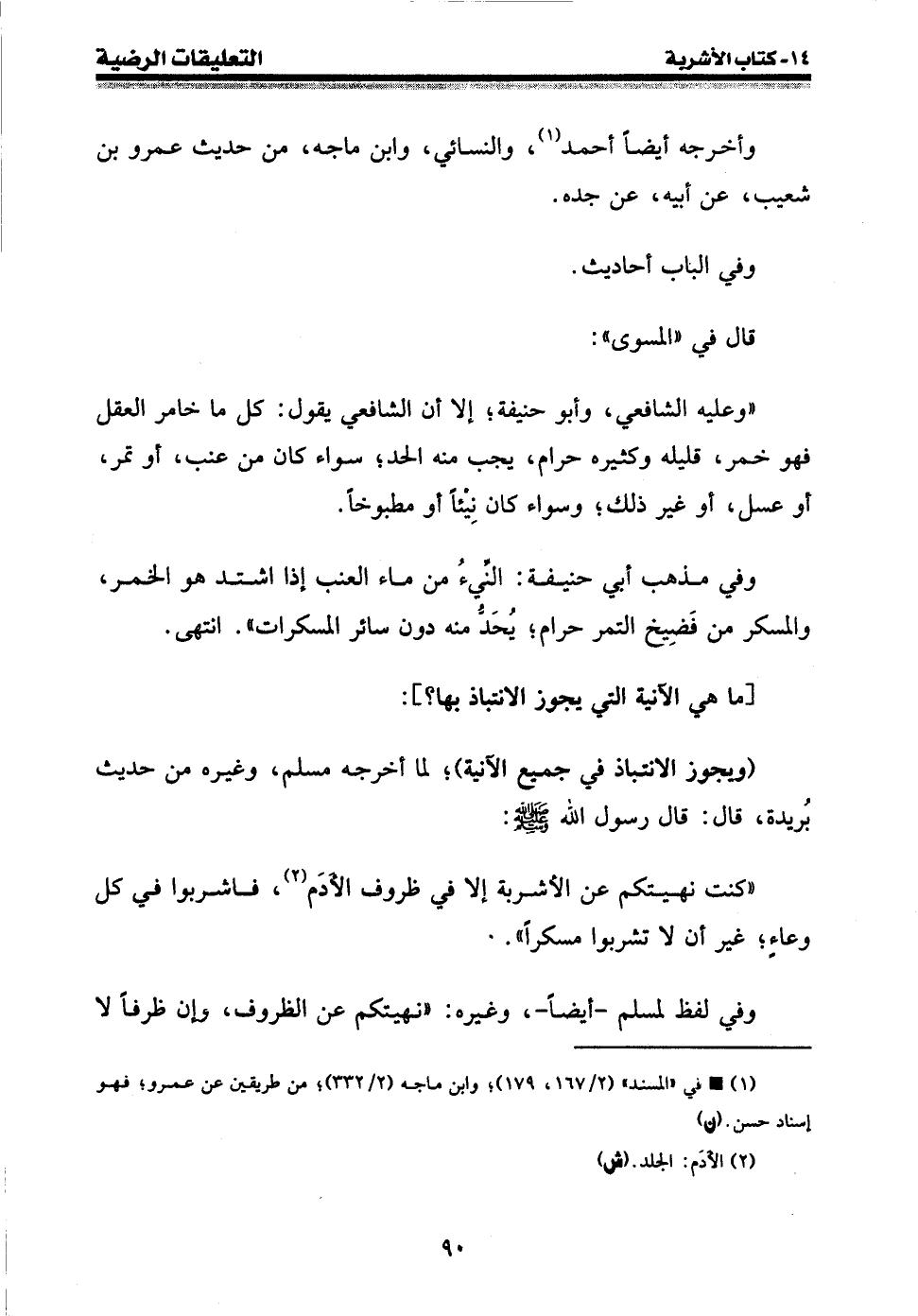 " وعليه الشافعي، وأبو حنيفة؛ إلا أن الشافعي يقول: كل ما خامر العقل فهو خمر، قليله وكثيره حرام، يجب منه الحد؛ سواء كان من عنب، أو تمر، أو عسل، أو غير ذلك؛ وسواء كان نيئا أو مطبوخا.
