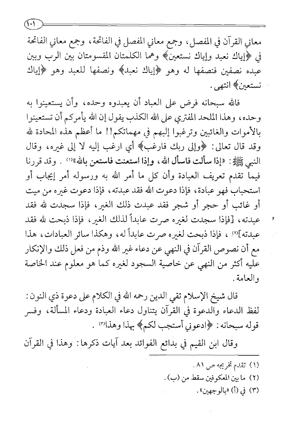 فالله سبحانه فرض على العباد أن يعبدوه وحده، وأن يستعينوا به وحده، وهذا الملحد المفتري على الله الكذب يقول إن الله يأمركم أن تستعينوا بالأموات والغائبين وترغبوا إليهم في مهماتكم!! ما أعظم هذه المحادة لله وقد قال تعالى: {وَإِلَى رَبِّكَ فَارْغَبْ} أي ارغب إليه لا إلى غيره، وقال النبي صلى الله عليه وسلم: "إذا سألت فأسأل الله وإذا استعنت فاستعن بالله" 1. وقد قررنا فيما تقدم تعريف العبادة وأن كل ما أمر الله به ورسوله أمر إيجاب أو استحباب فهو عبادة، فإذا دعوت الله فقد عبدته، فإذا دعوت غيره من ميت أو غائب أو حجر أو شجر فقد عبدت ذلك الغير، فإذا سجدت لله فقد عبدته، [فإذا سجدت لغيره صرت عابدا لذلك الغير، فإذا ذبحت لله فقد عبدته] 2، فإذا ذبحت لغيره صرت عابدا له، وهكذا سائر العبادات، هذا مع أن نصوص القرآن في النهي عن دعاء غير الله وذم من فعل ذلك والإنكار عليه أكثر من النهي عن خاصية السجود لغيره كما هو معلوم عند الخاصية والعامة.