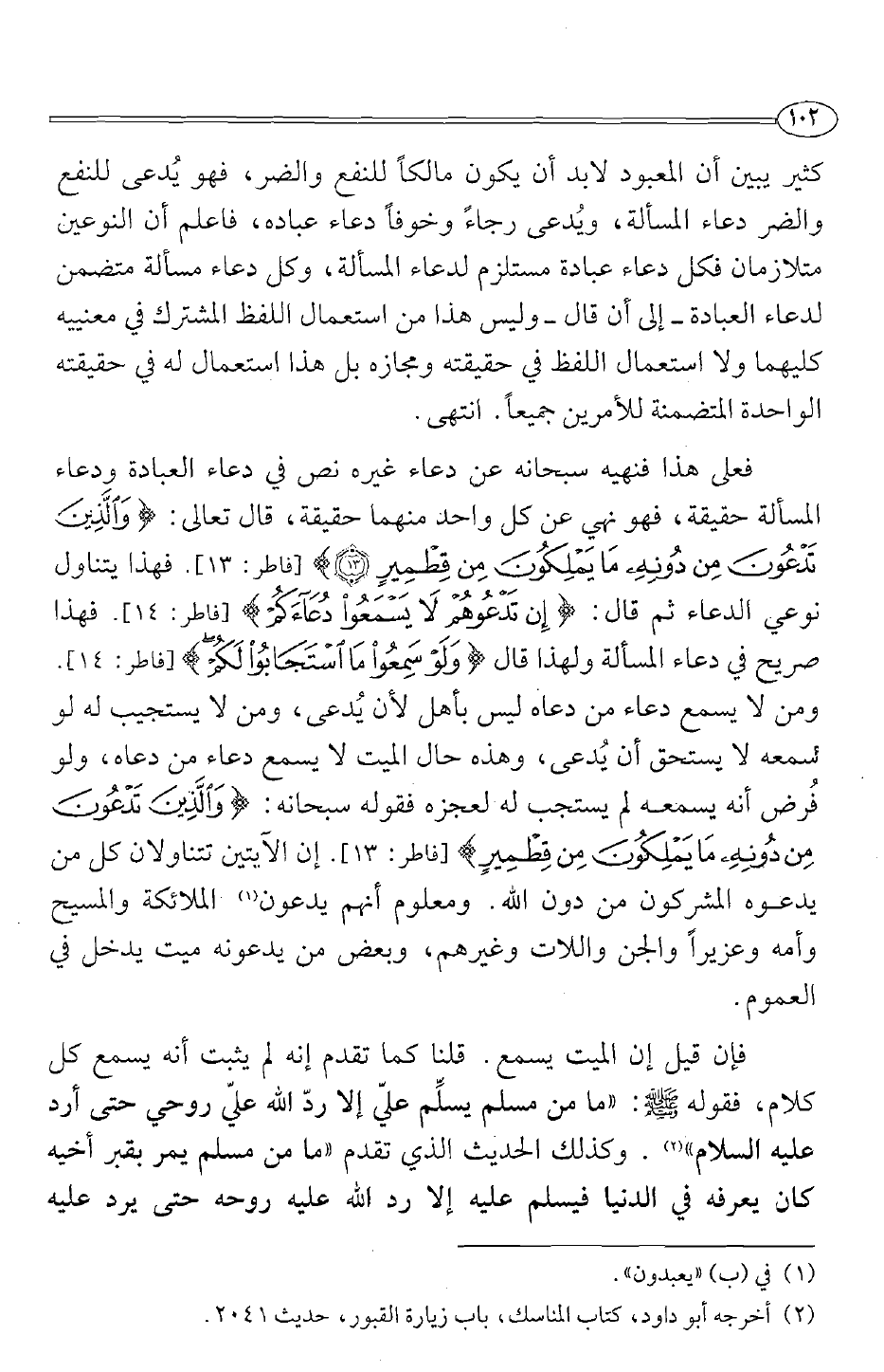 فعلى هذا فنهيه سبحانه عن دعاء غيره نص في دعاء العبادة ودعاء المسألة حقيقة، فهو نهي عن كل واحد منهما حقيقة، قال تعالى: {وَالَّذِينَ تَدْعُونَ مِنْ دُونِهِ مَا يَمْلِكُونَ مِنْ قِطْمِيرٍ} [فاطر:13] . فهذا يتناول نوعي الدعاء ثم قال: {إِنْ تَدْعُوهُمْ لَا يَسْمَعُوا دُعَاءَكُمْ} [فاطر:14] . فهذا صريح في دعاء المسألة ولهذا قال {وَلَوْ سَمِعُوا مَا اسْتَجَابُوا لَكُمْ} [فاطر:14] . ومن لا يسمع دعاء من دعاه ليس بأهل لأن يدعى، ومن لا يستجيب له لو سمعه لا يستحق أن يدعى، وهذه حال الميت لا يسمع دعاء من دعاه، ولو فرض أنه يسمعه لم يستجب له لعجزه فقوله سبحانه: {وَالَّذِينَ تَدْعُونَ مِنْ دُونِهِ مَا يَمْلِكُونَ مِنْ قِطْمِيرٍ} [فاطر:13] . إن الآيتين تتناولان كل من يدعوه المشركون من دون الله. ومعلوم أنهم يدعون الملائكة1 والمسيح وأمه وعزيرا والجن واللات وغيرهم، وبعض من يدعونه ميت يدخل في العموم.