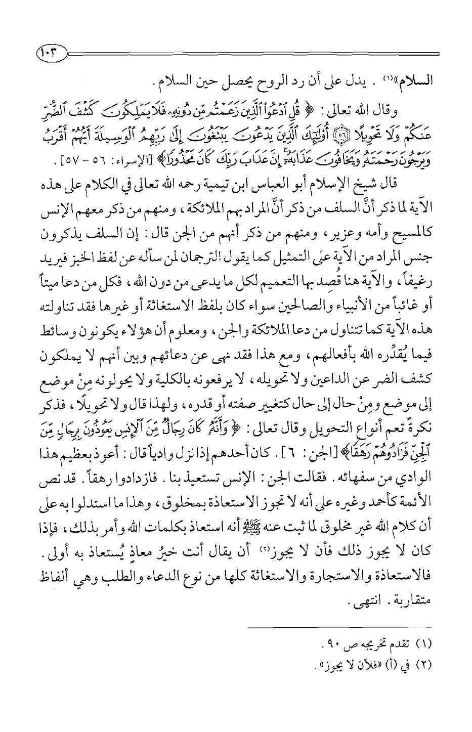 وعزير، ومنهم من ذكر أنهم من الجن قال: إن السلف يذكرون جنس المراد من الآية على التمثيل كما يقول الترجمان لمن سأله عن لفظ الخبز فيريد رغيفا، والآية هنا قصد بها التعميم لكل ما يدعى من دون الله، فكل من دعا ميتا أو غائبا من الأنبياء والصالحين سواء كان بلفظ الاستغاثة أو غيرها فقد تناولته هذه الآية كما تتناول من دعا الملائكة والجن، ومعلوم أن هؤلاء يكونون وسائط فيما يقدره الله بأفعالهم، ومع هذا فقد نهى عن دعائهم وبين أنهم لا يملكون كشف الضر عن الداعين ولا تحويله، لا يرفعونه بالكلية ولا يحولونه من موضع إلى موضع ومن حال إلى حال كتغير صفته أو قدره، ولهذا قال ولا تحويلا، فذكر نكرة تعم أنواع التحويل وقال تعالى: {وَأَنَّهُ كَانَ رِجَالٌ مِنْ الْإِنسِ يَعُوذُونَ بِرِجَالٍ مِنْ الْجِنِّ فَزَادُوهُمْ رَهَقًا} [الجن:6] . كان أحدهم إذا نزل واديا قال: أعوذ بعظيم هذا الوادي من سفهائه. فقالت الجن: الإنس تستعيذ بنا. فازدادوا رهقا. قد نص الأئمة كأحمد وغيره على أنه لا تجوز الاستعاذة بمخلوق، وهذا ما استدلوا به على أن كلام الله غير مخلوق لما ثبت عنه صلى الله عليه وسلم أنه استعاذ بكلمات الله وأمر بذلك، فإذا كان لا يجوز ذلك فأن لا يجوز2 أن يقال أنت خير معاذ يستعاذ به أولى. فالاستعاذة والاستجارة والاستغاثة كلها من نوع الدعاء والطلب وهي ألفاظ متقاربة انتهى.