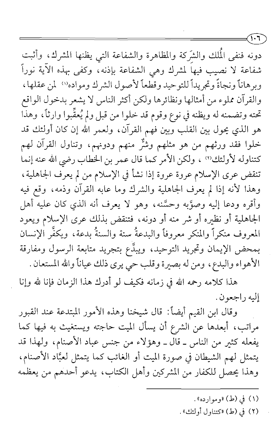 دونه فنفى الملك والشركة والمظاهرة والشفاعة التي يظنها المشرك، وأثبت شفاعة لا نصيب فيها لمشرك وهي الشفاعة بإذنه، وكفى بهذه الآية نورا وبرهانا ونجاة وتجريدا للتوحيد وقطعا لأصول الشرك ومواده1، لمن عقلها، والقرآن مملوء من أمثالها ونظائرها ولكن أكثر الناس لا يشعر بدخول الواقع تحته وتضمنه له ويظنه في نوع وقوم قد خلوا من قبل ولم يعقبوا وارثا، وهذا هو الذي يحول بين القلب وفهم القرآن، ولعمر الله إن كان أولئك قد خلوا فقد ورثهم من هو مثلهم وشر منهم ودونهم، وتناول القرآن لهم كتناوله لأولئك2، ولكن الأمر كما قال عمر بن الخطاب رضي الله عنه إنما تنقض عرى الإسلام عروة عروة إذا نشأ في الإسلام من لم يعرف الجاهلية، وهذا لأنه إذا لم يعرف الجاهلية والشرك وما عابه القرآن وذمه، وقع فيه وأقره ودعا إليه وصوبه وحسنه، وهو لا يعرف أنه الذي كان عليه أهل الجاهلية أو نظيره أو شر منه أو دونه، فتنقض بذلك عرى الإسلام ويعود المعروف منكرا والمنكر معروفا والبدعة سنة والسنة بدعة، ويكفر الإنسان بمحض الإيمان وتجريد التوحيد، ويبدع بتجريد متابعة الرسول ومفارقة الأهواء والبدع، ومن له بصيرة وقلب حي يرى ذلك عيانا والله المستعان.