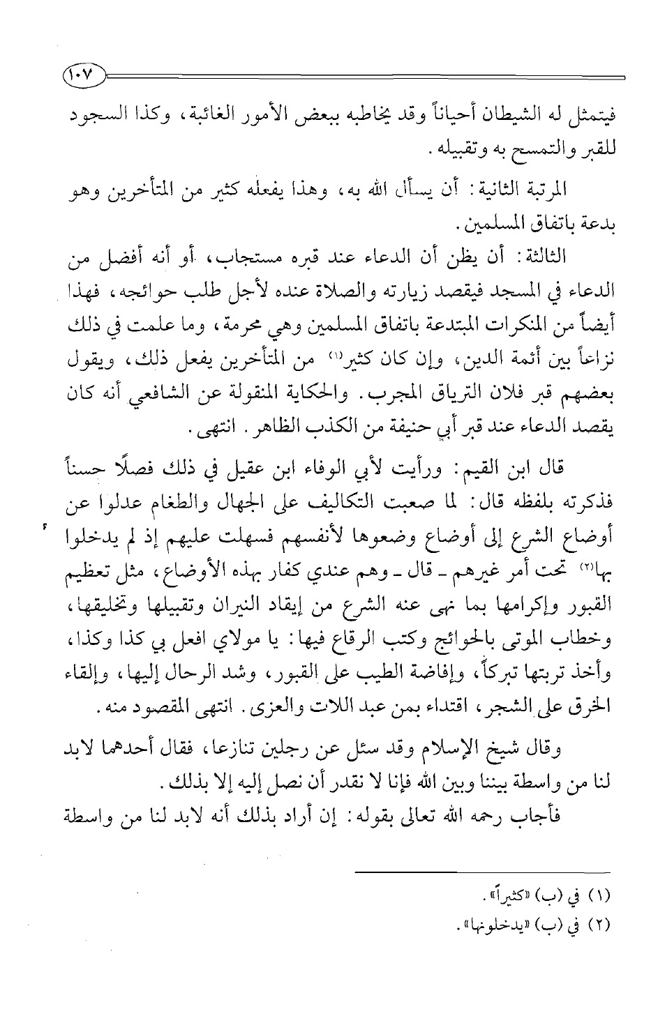 قال ابن القيم: ورأيت لأبي الوفاء ابن عقيل في ذلك فصلا حسنا فذكرته بلفظه قال: لما صعبت التكاليف على الجهال والطغام عدلوا عن أوضاع الشرع إلى أوضاع وضعوها لأنفسهم فسهلت عليهم إذ لم يدخلوا بها2 تحت أمر غيرهم - قال - وهم عندي كفار بهذه الأوضاع، مثل تعظيم القبور وإكرامها بما نهى عنه الشرع من إيقاد النيران وتقبيلها وتخليقها، وخطاب الموتى بالحوائج وكتب الرقاع فيها: يا مولاي افعل بي كذا وكذا، وأخذ تربتها تبركا، وإفاضة الطيب على القبور، وشد الرحال إليها، وإلقاء الخرق على الشجر، إقتداء بمن عبد اللات والعزى. انتهى المقصود منه.