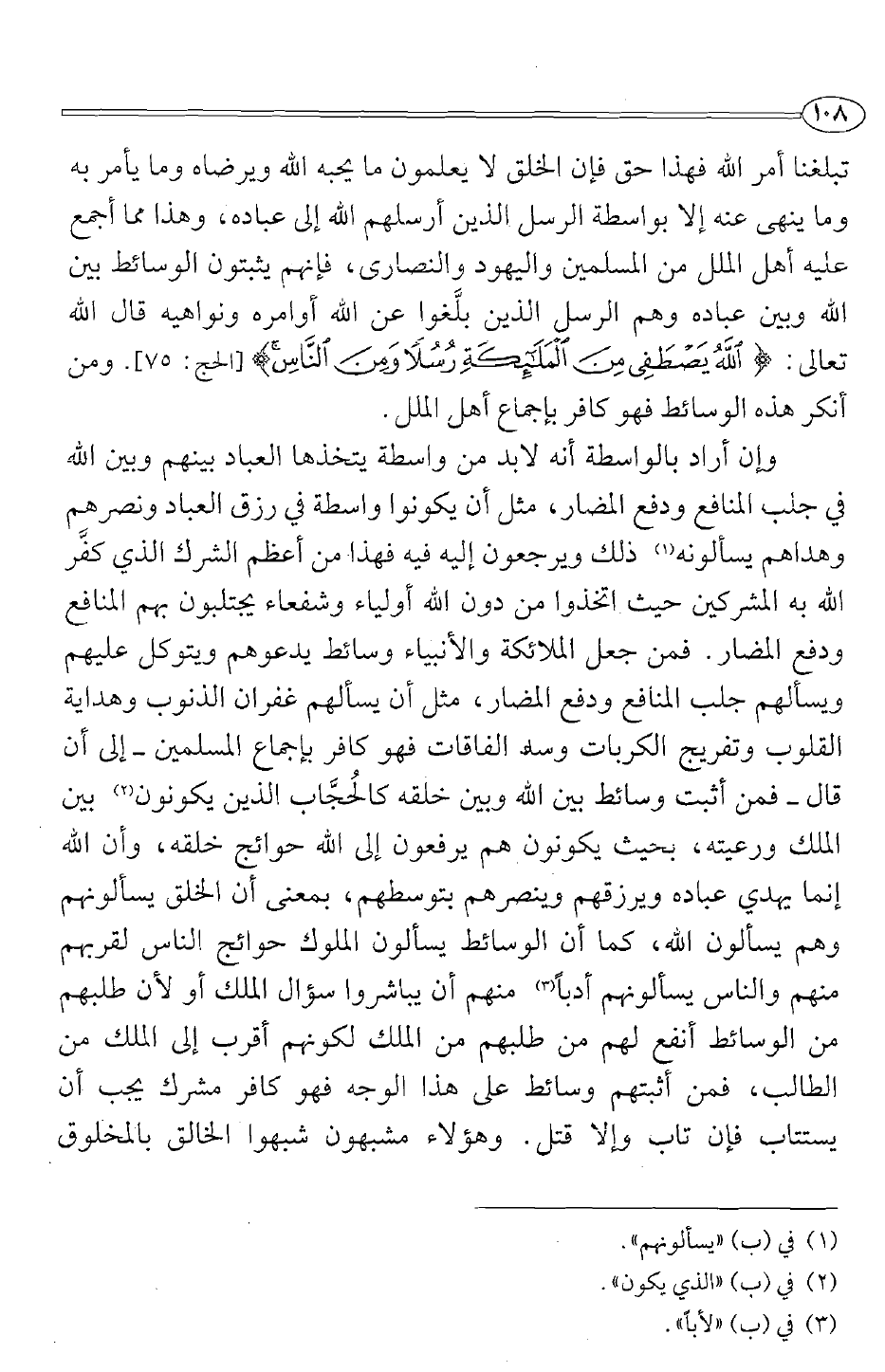 وإن أراد بالواسطة أنه لابد من واسطة يتخذها العباد بينهم وبين الله في جلب المنافع ودفع المضار، مثل أن يكونوا واسطة في رزق العباد ونصرهم وهداهم يسألونه1 ذلك ويرجعون إليه فيه فهذا من أعظم الشرك الذي كفر الله به المشركين حيث اتخذوا من دون الله أولياء وشفعاء يجتلبون بهم المنافع ودفع المضار. فمن جعل الملائكة والأنبياء وسائط يدعوهم ويتوكل عليهم ويسألهم جلب المنافع ودفع المضار، مثل أن يسألهم غفران الذنوب وهداية القلوب وتفريج الكربات وسد الفاقات فهو كافر بإجماع المسلمين -إلى أن قال- فمن أثبت وسائط بين الله وبين خلقه كالحجاب الذين يكونون2 بين الملك ورعيته، بحيث يكونون هم يرفعون إلى الله حوائج خلقه، وأن الله إنما يهدي عباده ويرزقهم وينصرهم بتوسطهم، بمعنى أن الخلق يسألونهم وهم يسألون الله، كما أن الوسائط يسألون الملوك حوائج الناس لقربهم منهم والناس يسألونهم أدبا3 منهم أن يباشروا سؤال الملك أو لأن طلبهم من الوسائط أنفع لهم من طلبهم من الملك لكونهم أقرب إلى الملك من الطالب، فمن أثبتهم وسائط على هذا الوجه فهو كافر مشرك يجب أن يستتاب، فإن تاب وإلا قتل. وهؤلاء مشبهون شبهوا الخالق بالمخلوق