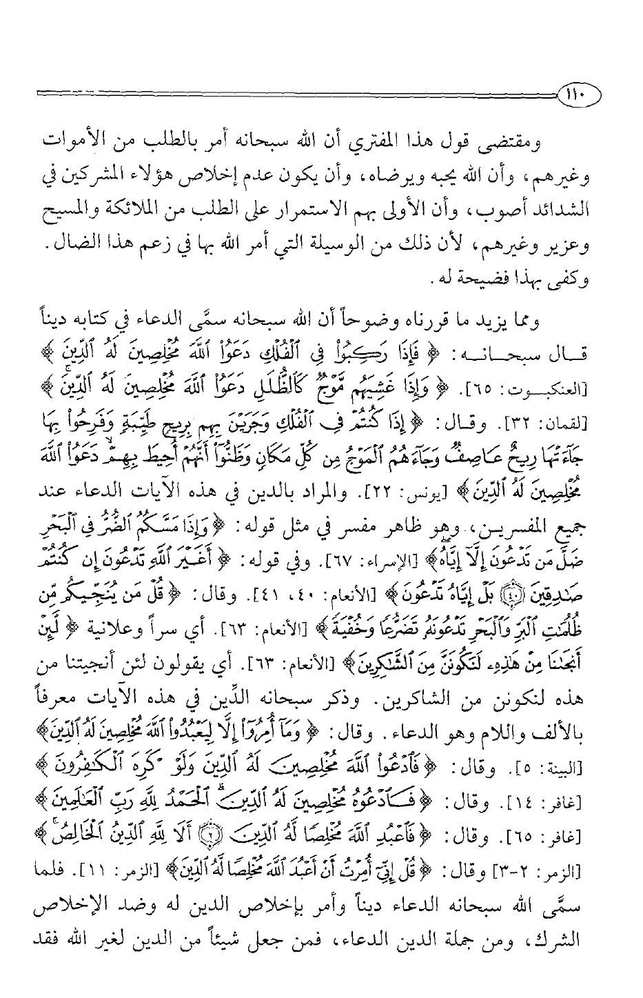 وقال: {حتى إِذَا كُنْتُمْ فِي الْفُلْكِ وَجَرَيْنَ بِهِمْ بِرِيحٍ طَيِّبَةٍ وَفَرِحُوا بِهَا جَاءَتْهَا رِيحٌ عَاصِفٌ وَجَاءَهُمْ الْمَوْجُ مِنْ كُلِّ مَكَانٍ وَظَنُّوا أَنَّهُمْ أُحِيطَ بِهِمْ دَعَوْا اللَّهَ مُخْلِصِينَ لَهُ الدِّينَ} [يونس 22] . والمراد بالدين في هذه الآيات الدعاء عند جميع المفسرين، وهو ظاهر مفسر في مثل قوله: