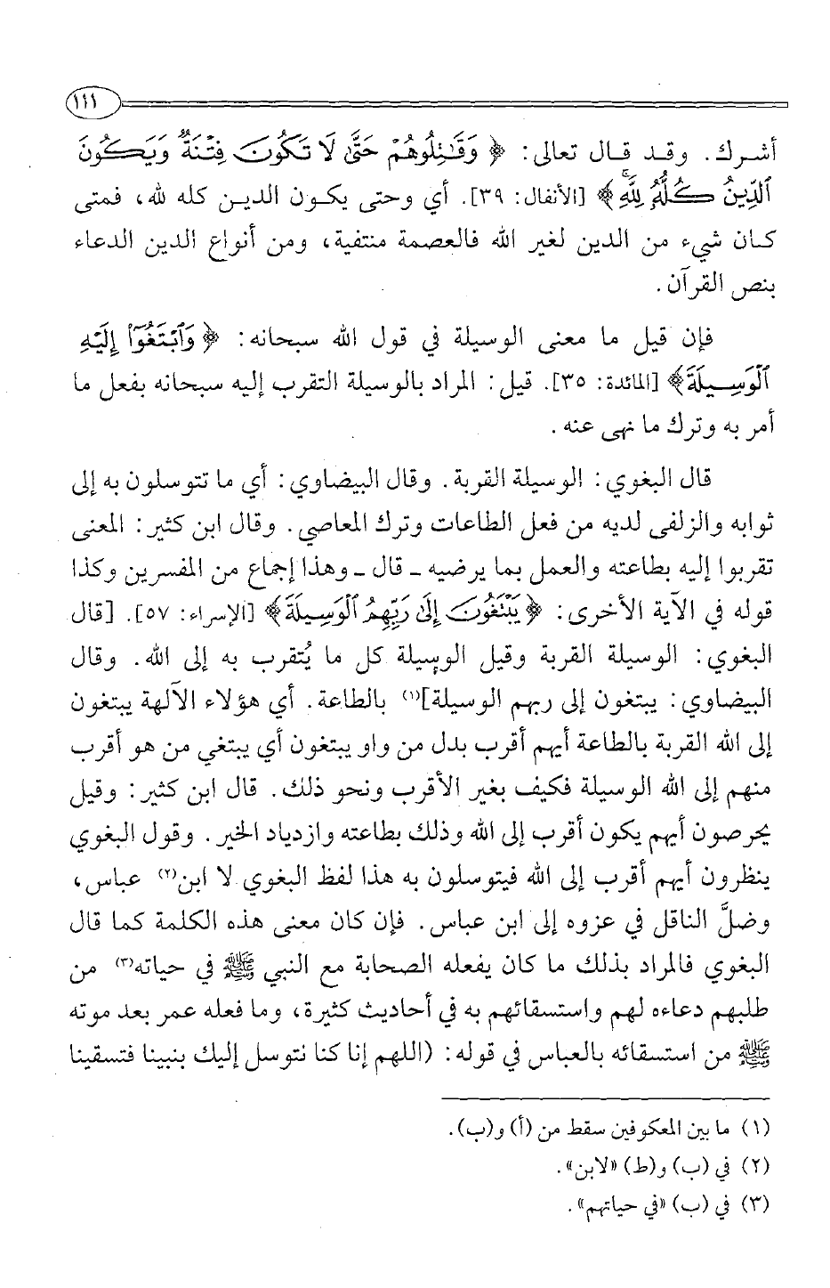 وقال ابن كثير: المعنى تقربوا إليه بطاعته والعمل بما يرضيه –قال- وهذا إجماع من المفسرين وكذا قوله في الآية الأخرى: {يَبْتَغُونَ إِلَى رَبِّهِمْ الْوَسِيلَةَ} [الإسراء:57] . [قال البغوي الوسيلة القربة وقيل الوسيلة كل ما يتقرب به إلى الله. وقال البيضاوي: يبتغون إلى ربهم الوسيلة] 1 بالطاعة. أي هؤلاء الآلهة يبتغون إلى الله القربة بالطاعة أيهم اقرب بدل من واو يبتغون أي يبتعي من هو اقرب منهم إلى الله الوسيلة فكيف بغير الأقرب ونحو ذلك. قال ابن كثير: وقيل يحرصون أيهم بكون أقرب إلى الله وذلك بطاعته وازدياد الخير. وقول البغوي ينظرون أيهم أقرب إلى الله فيتوسلون به هذا لفظ البغوي لا ابن2 عباس، وضل الناقل في عزوه إلى ابن عباس. فان كان معنى هذه الكلمة كما قال البغوي فالمراد بذلك ما كان يفعله الصحابة مع النبي صلى الله عليه وسلم في حياته3 من طلبهم دعاءه لهم واستسقائهم به في أحاديث كثيرة، وما فعله عمر بعد موته صلى الله عليه وسلم من استسقائه بالعباس في قوله: "اللهم إنا كنا نتوسل إليك بنبينا فتسقينا