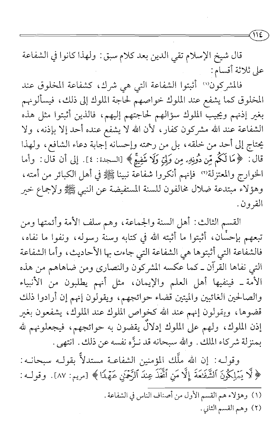 قال شيخ الإسلام تقي الدين بعد كلام سبق: ولهذا كانوا في الشفاعة على ثلاثة أقسام: