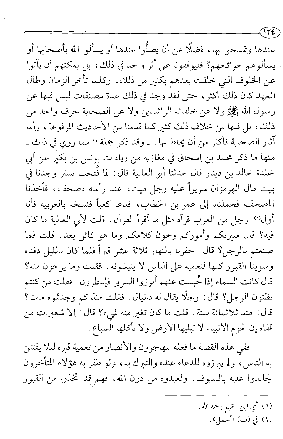 عندها وتمسحوا بها، فضلا عن أن يصلوا عندها أو يسألوا الله بأصحابها أو يسألوهم حوائجهم؟ فليوقفونا على أثر واحد في ذلك، بل يمكنهم أن يأتوا على الخلوف التي خلفت بعدهم بكثير من ذلك، وكلما تأخر الزمان وطال العهد كان ذلك أكثر، حتى لقد وجد في ذلك عدة مصنفات ليس فيها عن رسول الله صلى الله عليه وسلم ولا عن خلفائه الراشدين ولا عن الصحابة حرف واحد من ذلك، بل فيها من خلاف ذلك كثير كما قدمنا من الأحاديث المرفوعة، وأما آثار الصحابة فأكثر من أن يحاط بها.