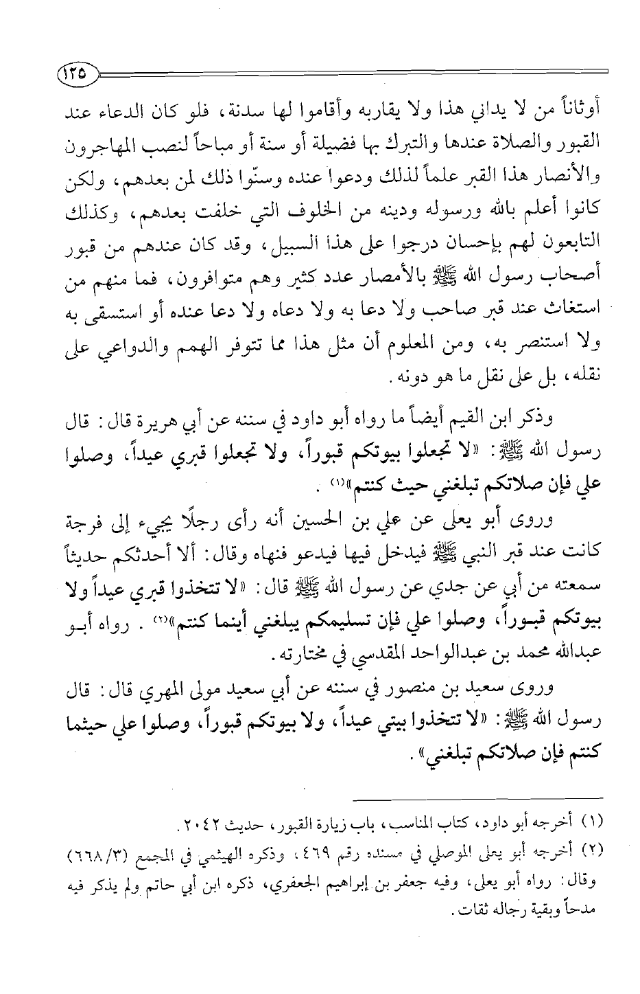 وذكر ابن القيم أيضا ما رواه أبو داود في سننه عن أبي هريرة قال: قال رسول الله صلى الله عليه وسلم: "لا تجعلوا بيوتكم قبورا، ولا تجعلوا قبري عيدا، وصلوا علي فإن صلاتكم تبلغني حيث كنتم"1.