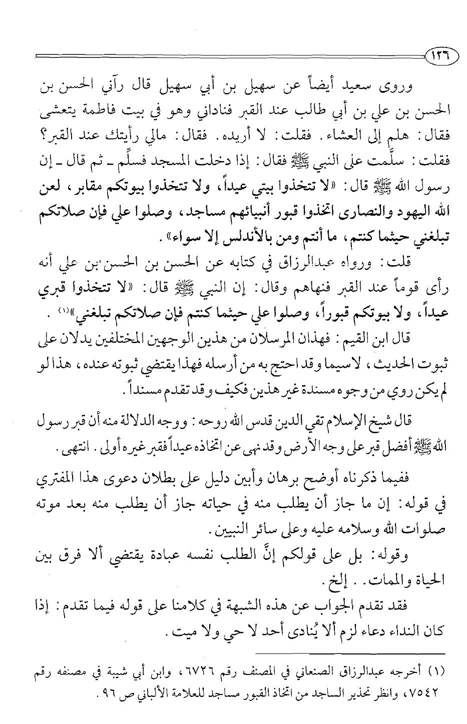 قلت: ورواه عبد الرزاق في كتابه عن الحسن بن الحسن بن علي أنه رأى قوما عند القبر فنهاهم وقال: إن النبي صلى الله عليه وسلم قال: "لا تتخذوا قبري عيدا، ولا بيوتكم قبورا، وصلو علي حيثما كنتم فإن صلاتكم تبلغني"1.