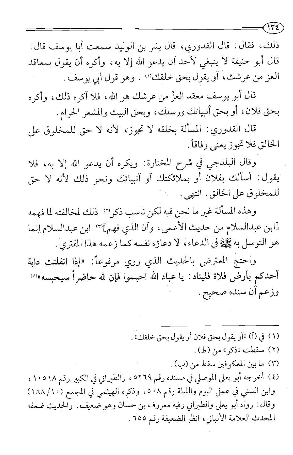 واحتج المعترض بالحديث الذي روي مرفوعا: "إذا انفلتت دابة أحدكم بأرض فلاة فليناد: يا عباد الله احبسوا فإن لله حاضرا سيحبسه" 4 وزعم أن سنده صحيح.