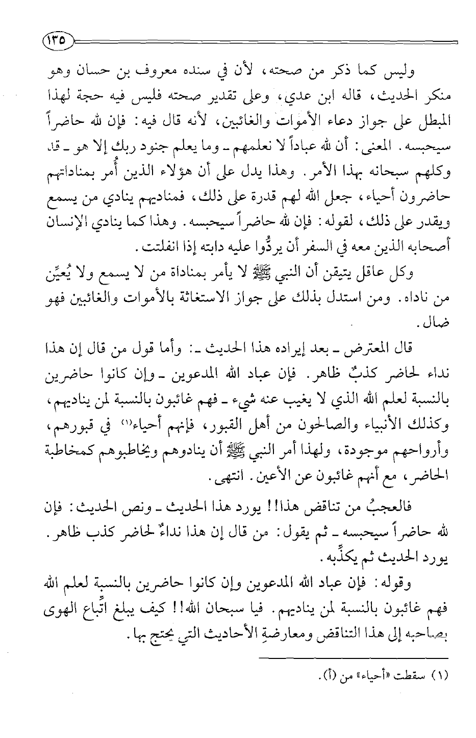 وقوله: فإن عباد الله المدعوين وإن كانوا حاضرين بالنسبة لعلم الله فهم غائبون بالنسبة لمن يناديهم. فيا سبحان الله!! كيف يبلغ اتباع الهوى بصاحبه إلى هذا التناقض ومعارضة الأحاديث التي يحتج بها.