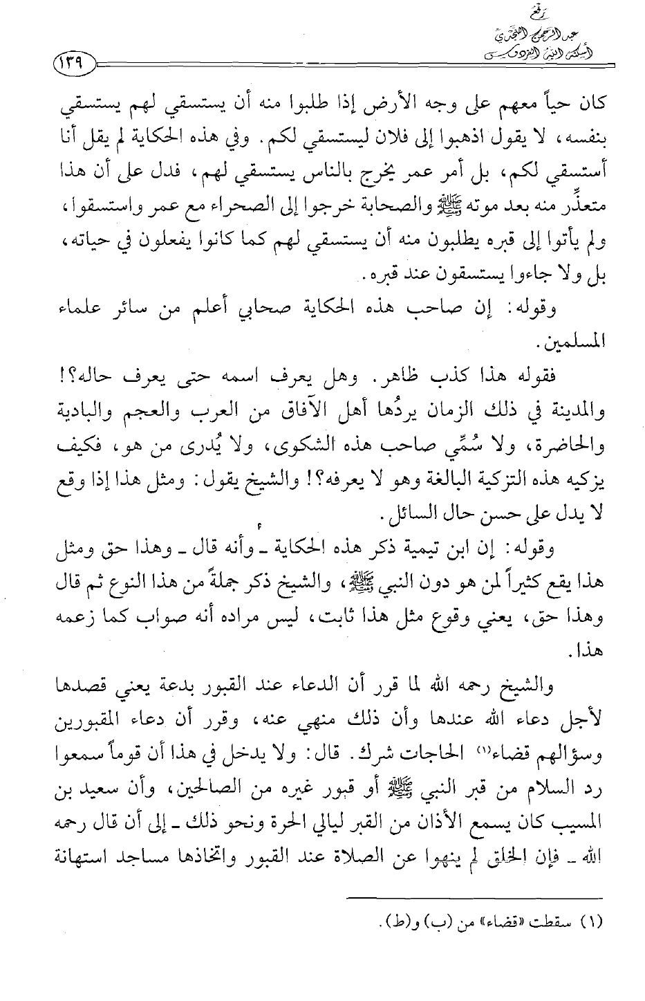 كان حيا معهم على وجه الأرض إذا طلبوا منه أن يستقي لهم يستسقي بنفسه، لا يقول اذهبوا إلى فلان ليستسقي لكم. وفي هذه الحكاية لم يقل أنا أستسقي لكم، بل أمر عمر يخرج بالناس يستسقي لهم، فدل على أن هذا متعذر منه بعد موته صلى الله عليه وسلم والصحابة خرجوا إلى الصحراء مع عمر واستسقوا، ولم يأتوا إلى قبره يطلبون منه أن يستسقي لهم كما كانوا يفعلون في حياته، بل ولا جاءوا يستسقون عند قبره.