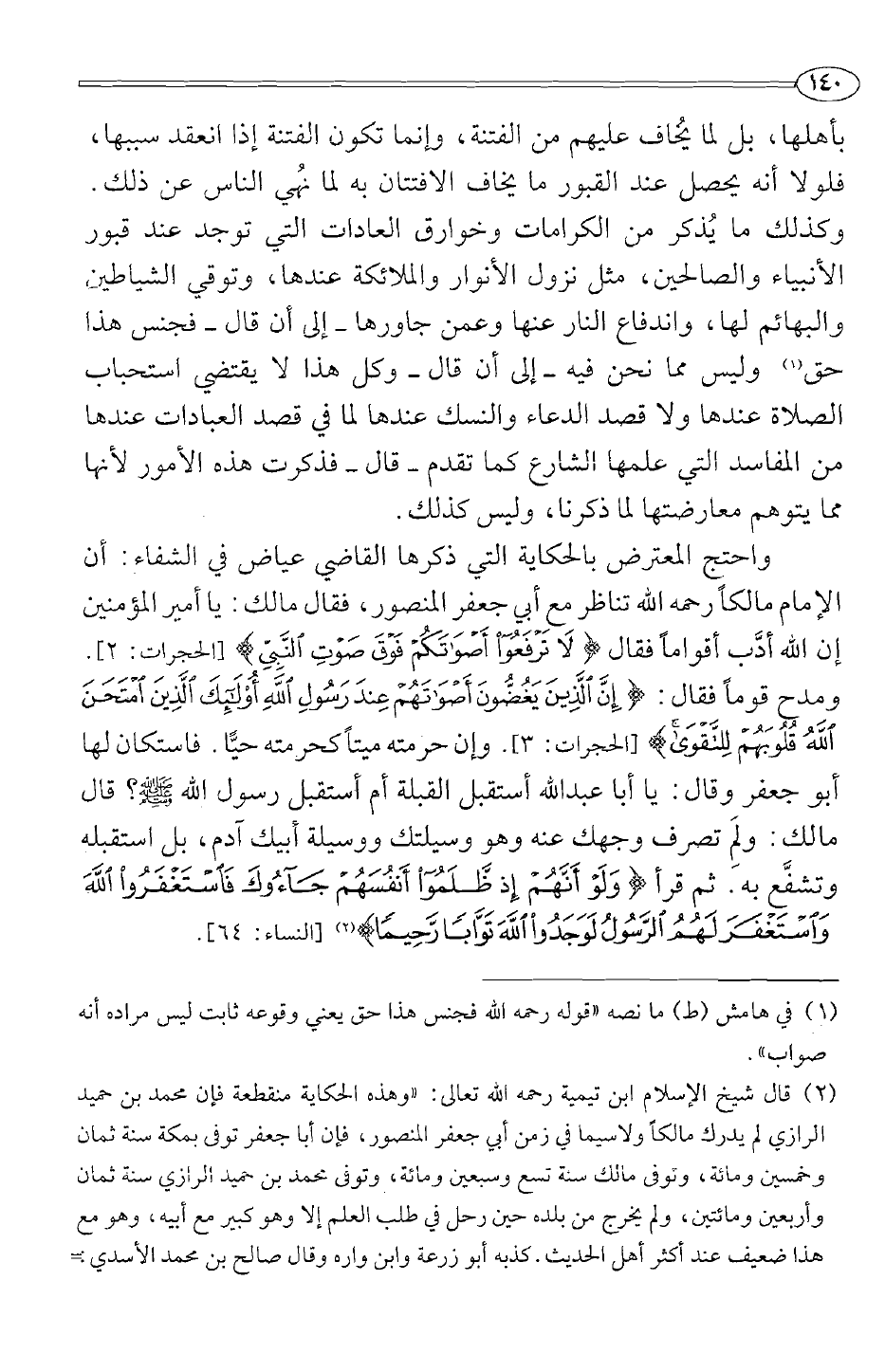 واحتج المعترض بالحكاية التي ذكرها القاضي عياض في الشفاء: أن الإمام مالكا رحمه الله تناظر مع أبي جعفر المنصور، فقال مالك: يا أمير المؤمنين إن الله أدب أقواما فقال {لَا تَرْفَعُوا أَصْوَاتَكُمْ فَوْقَ صَوْتِ النَّبِيِّ} [الحجرات:2] . ومدح قوما فقال: {إِنَّ الَّذِينَ يَغُضُّونَ أَصْوَاتَهُمْ عِنْدَ رَسُولِ اللَّهِ أُوْلَئِكَ الَّذِينَ امْتَحَنَ اللَّهُ قُلُوبَهُمْ لِلتَّقْوَى} [الحجرات:3] .