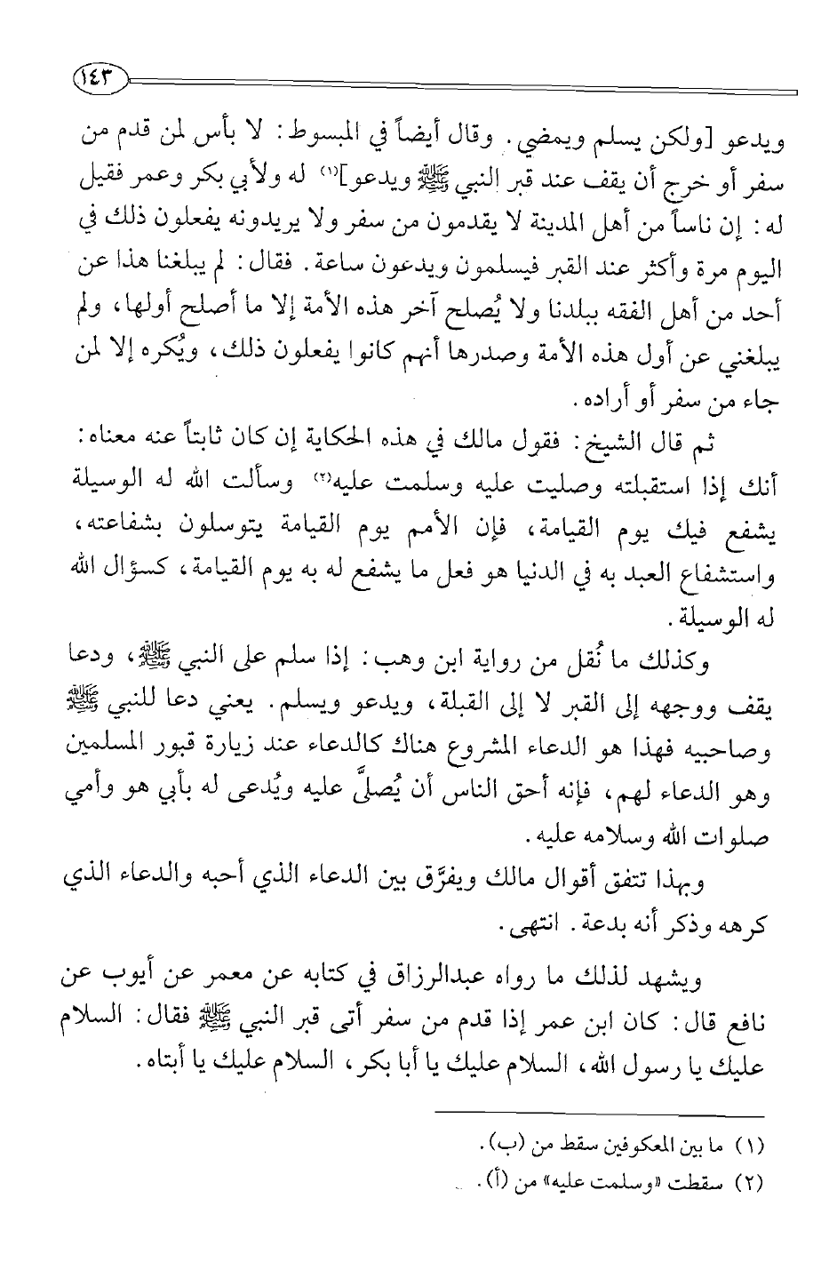 ثم قال الشيخ: فقول مالك في هذه الحكاية إن كان ثابتا عنه معناه: أنك إذا استقبلته وصليت عليه وسلمت عليه2 وسألت الله له الوسيلة يشفع فيك يوم القيامة، فإن الأمم يوم القيامة يتوسلون بشفاعته، واستشفاع العبد به في الدنيا هو فعل ما يشفع له به يوم