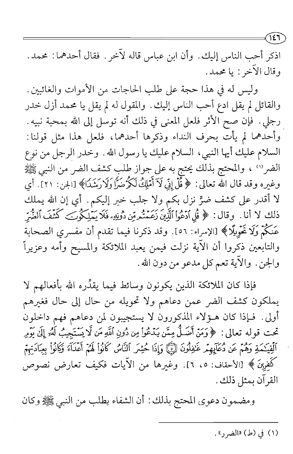 وأحدهما لم يأت بحرف النداء وذكرها أحدهما، فلعل هذا مثل قولنا: السلام عليك أيها النبي، السلام عليك يا رسول الله. وخدر الرجل من نوع الضر1، والمحتج بذلك يحتج به على جواز طلب كشف الضر من النبي صلى الله عليه وسلم وغيره وقد قال الله تعالى: