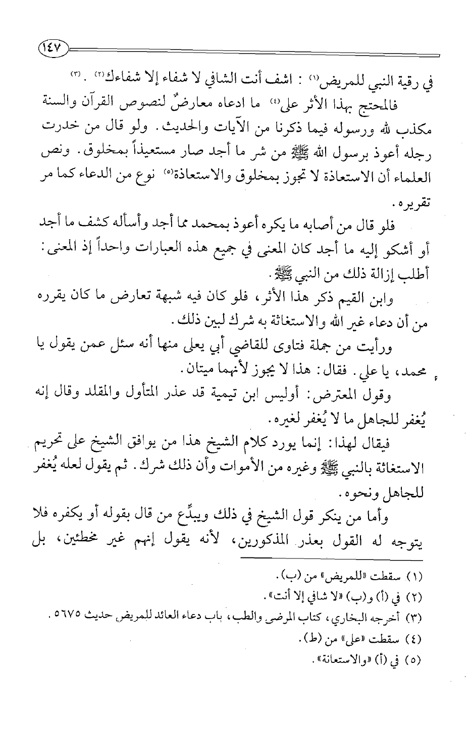 فالمحتج بهذا الأثر على4 ما ادعاه معارض لنصوص القرآن والسنة مكذب لله ورسوله فيما ذكرنا من الآيات والحديث. ولو قال من خدرت رجله أعوذ برسول الله صلى الله عليه وسلم من شر ما أجد صار مستعيذا بمخلوق. ونص العلماء أن الاستعاذة لا تجوز بمخلوق والاستعاذة5 نوع من الدعاء كما أمر تقريره.