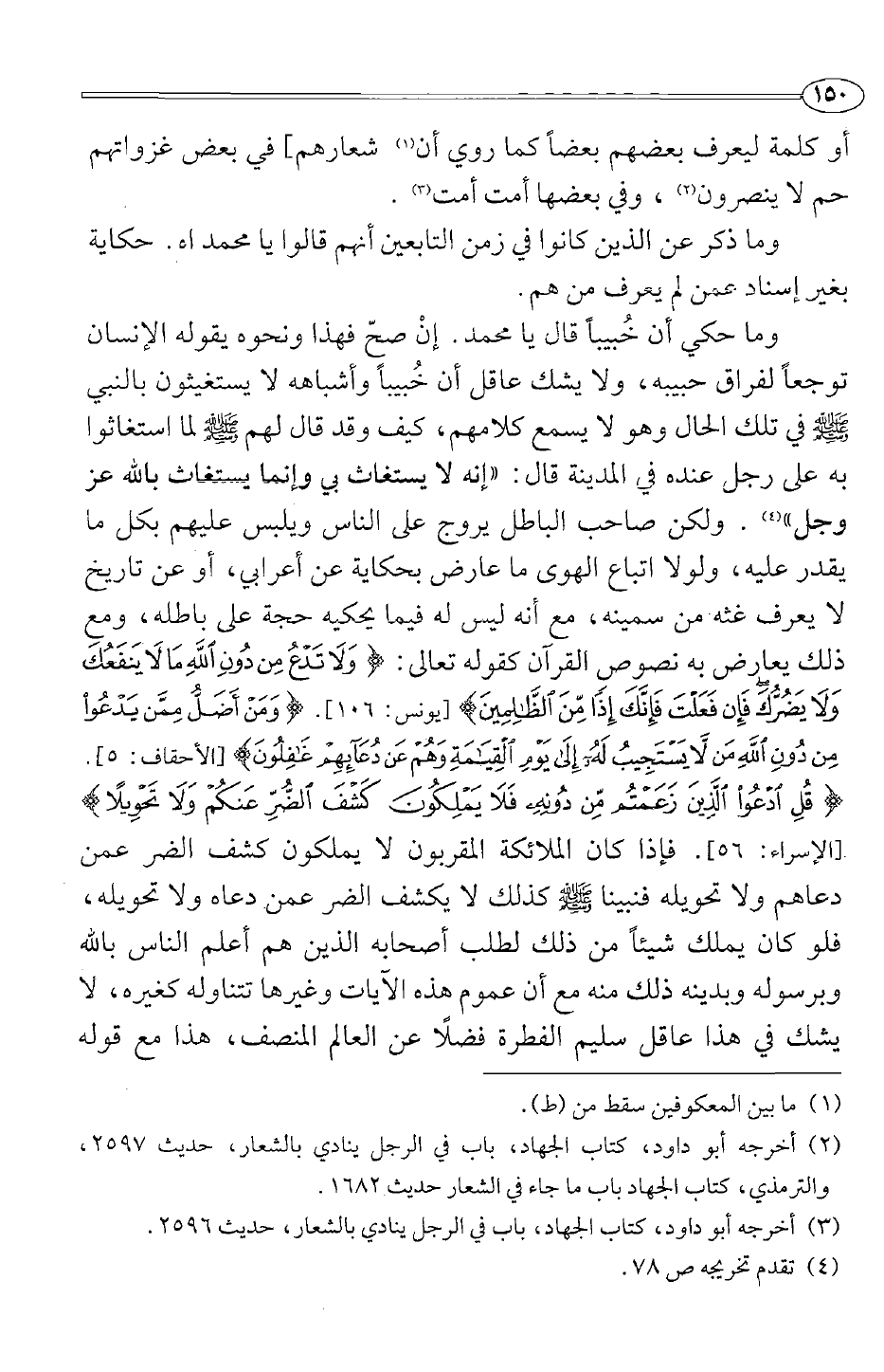 وما حكي أن خبيبا قال يامحمد. إن صح فهذا ونحوه يقوله الإنسان توجعا لفراق حبيبه، ولا يشك عاقل أن خبيبا وأشباهه لا يستغيثون بالنبي صلي الله عليه وسلم في تلك الحال وهو لا يسمع كلامهم، كيف وقال لهم صلى الله عليه وسلم لما استغاثوا به على رجل عنده في المدينة قال: "إنه لايستغاث بي وإنما يستغاث بالله عز وجل" 4 ولكن صاحب الباطل يروج على الناس ويلبس عليهم بكل ما يقدر عليه، ولولا إتباع الهوى ما عارض بحكاية عن أعرابي، أو عن تاريخ لا يعرف غثه من سمينه، مع أنه ليس له فيما يحكيه حجة على باطله ومع ذلك يعارض به نصوص القرآن كقوله تعالى {وَلَا تَدْعُ مِنْ دُونِ اللَّهِ مَا لَا يَنْفَعُكَ وَلَا يَضُرُّكَ فَإِنْ فَعَلْتَ فَإِنَّكَ إِذًا مِنْ الظَّالِمِينَ} [يونس:106] {وَمَنْ أَضَلُّ مِمَّنْ يَدْعُو مِنْ دُونِ اللَّهِ مَنْ لَا يَسْتَجِيبُ لَهُ إِلَى يَوْمِ الْقِيَامَةِ وَهُمْ عَنْ دُعَائِهِمْ غَافِلُونَ} [الأحقاف:5] {قُلْ ادْعُوا الَّذِينَ زَعَمْتُمْ مِنْ دُونِهِ فَلَا يَمْلِكُونَ كَشْفَ الضُّرِّ عَنكُمْ وَلَا تَحْوِيلًا} [الإسراء:56] فإذا كان الملائكة المقربون لايملكون كشف الضر عمن دعاهم ولا تحويله فنبينا صلى الله عليه وسلم كذلك لا يكشف الضر عمن دعاه ولا تحويله، فلو كان يملك شيئا من ذلك لطلب أصحابه الذين هم أعلم الناس بالله وبرسوله وبدينه ذلك منه مع أن عموم هذه الآيات وغيرها تتناوله كغيره، لايشك في هذا عاقل سليم الفطرة فضلا عن العالم المنصف، هذا مع قوله