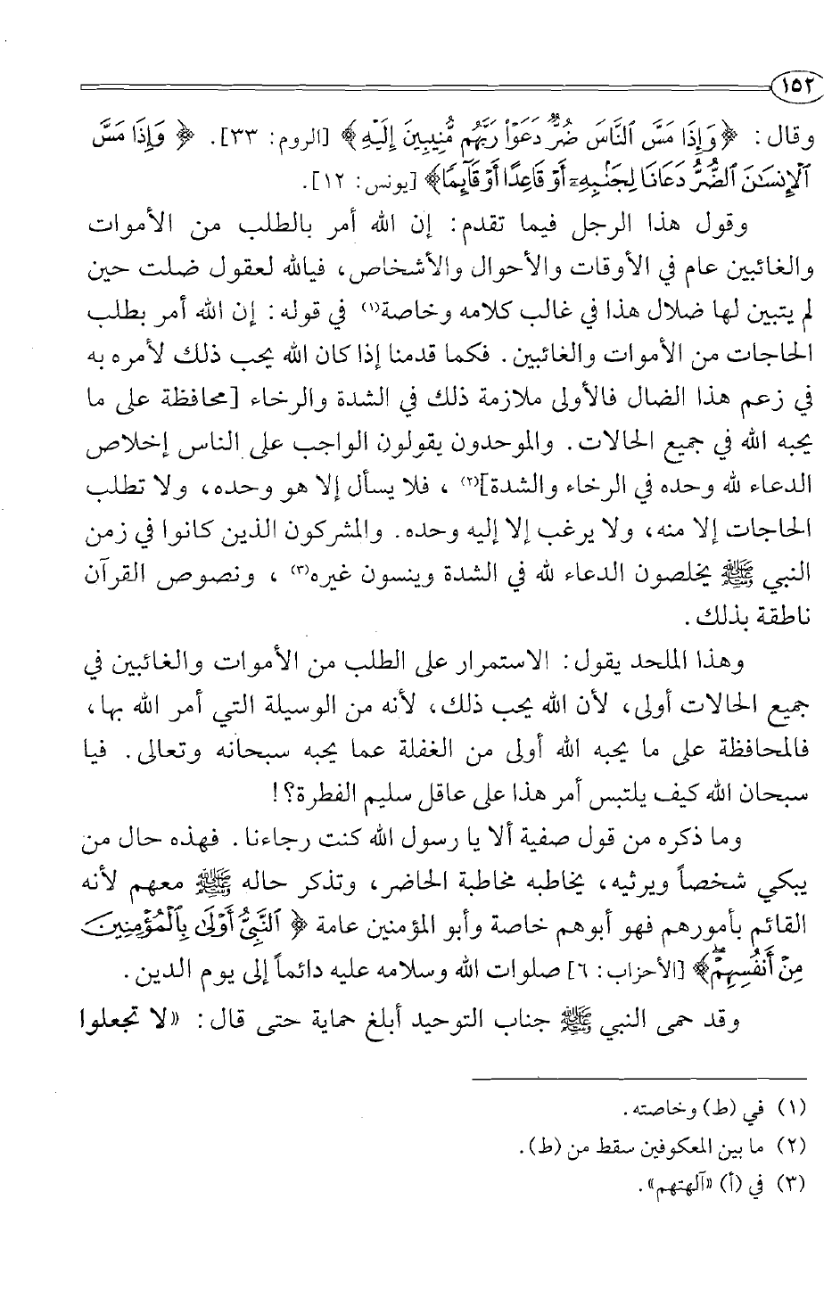 وقول هذا الرجل فيما تقدم: إن الله أمر بالطلب من الأموات والغائبين عام في الأوقات والأحوال والأشخاص، فيا لله لعقول ضلت حين لم يتبين لها ضلال هذا في غالب كلامه وخاصة1 في قوله: إن الله أمر بطلب الحاجات من الأموات والغائبين. فكما قدمنا إذا كان الله يحب ذلك لأمره به في زعم هذا الضال فالأولى ملازمة ذلك في الشدة والرخاء [محافظة على ما يحبه الله في جميع الحالات. والموحدون يقولون الواجب على الناس إخلاص الدعاء لله وحده في الرخاء والشدة] 2،فلا يسأل إلا هو وحده، ولا تطلب الحاجات إلا منه، ولا يرغب إلا إليه وحده. والمشركون الذين كانوا في زمن النبي صلى الله عليه وسلم يخلصون الدعاء لله في الشدة وينسون غيره3، ونصوص القرآن ناطقة بذلك.