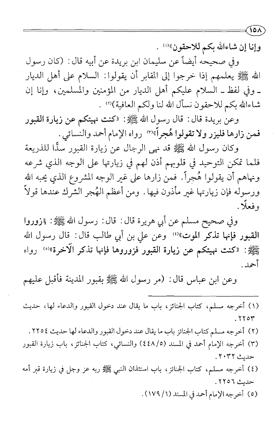 وعن بريدة قال: قال رسول الله صلى الله عليه وسلم:" كنت نهيتكم عن زيارة القبور فمن زارها فليزر ولا تقولوا هجرا" 3 رواه الإمام أحمد والنسائي.