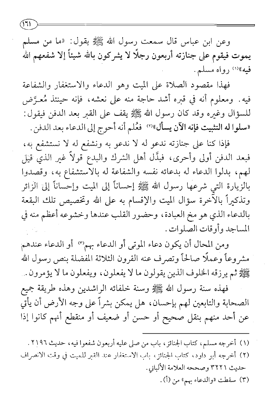 ومن المحال أن يكون دعاء الموتى أو الدعاء بهم3 أو الدعاء عندهم مشروعا وعملا صالحا وتصرف عنه القرون الثلاثة المفضلة بنص رسول الله صلى الله عليه وسلم ثم يرزقه الخلوف الذين يقولون ما لا يفعلون، ويفعلون ما لا يؤمرون.